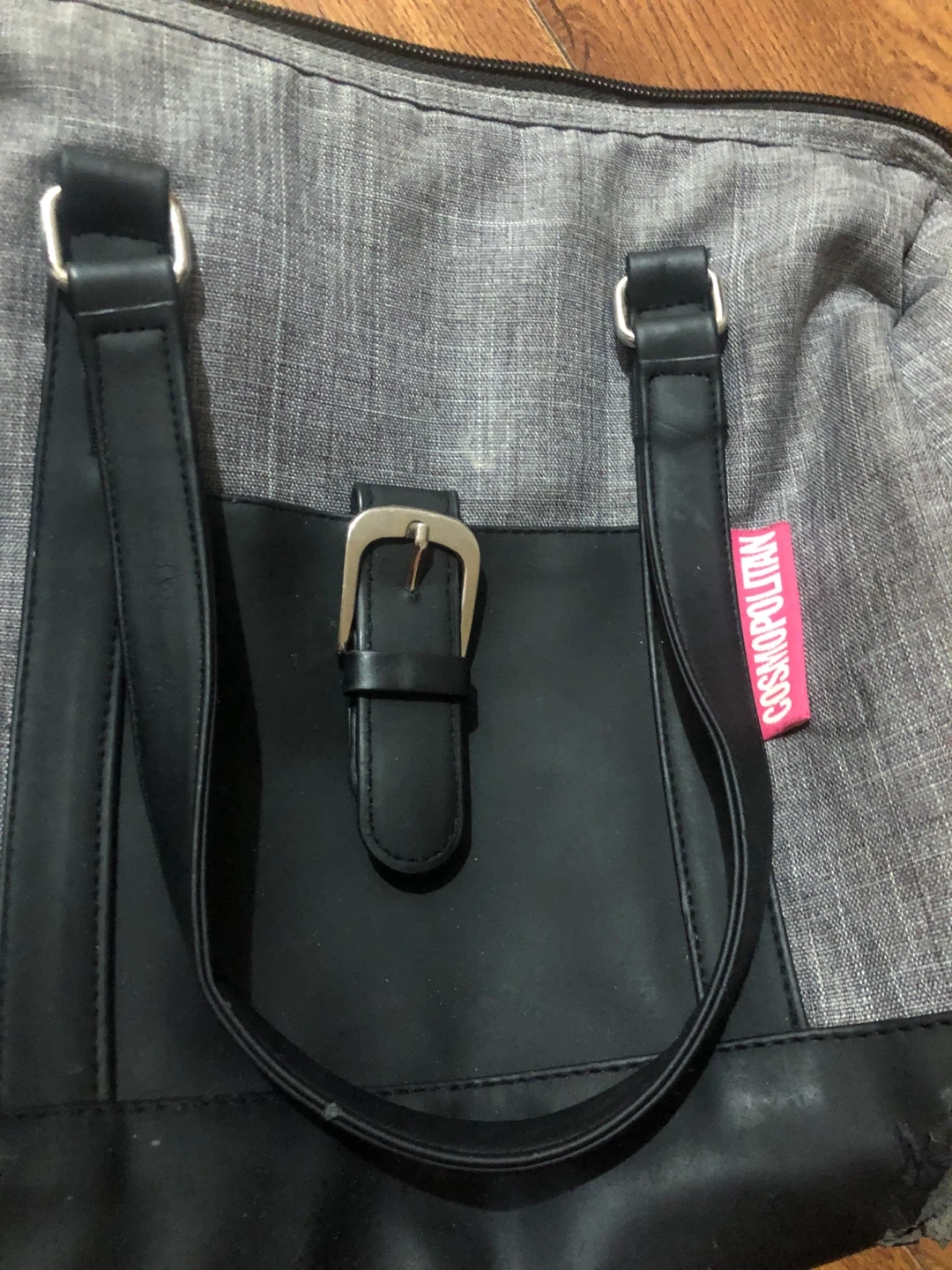 Cosmopolitan diaper bag in grey and black. It has some wear and tear on the bottom but is still functional. Great for parents on the go! Condition as shown- in pics