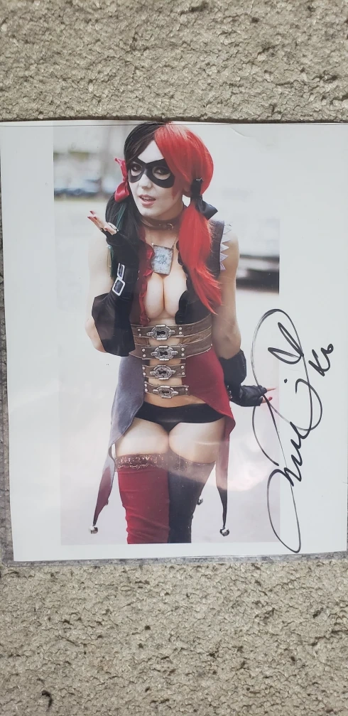 Legendary cosplayer and voice actress (RWBY), Jessica Nigri, is featured as Harley Quinn in this spicy 8.5" x 11" photograph with AUTOGRAPH. Comes with a plastic photograph protector. Obtained at Fan Expo Toronto in around 2014, when she appeared as a guest. Photo and signature were both purchased at Jessica Nigri's booth. Size: 8.5" x 11" There is some crinkling at the top of the photograph from sitting in a box. Otherwise it's in great shape and has not been taken out of the plastic protector since it was first signed. Makes a perfect gift for the cosplay or RWBY lover in your family. We accept Interact e-Transfer and PayPal, as well as cash. NO SHIPPING and NO DELIVERY. Curbside pickup ONLY. If you are interested in purchasing this product or have any further inquiries, please send us a direct message.