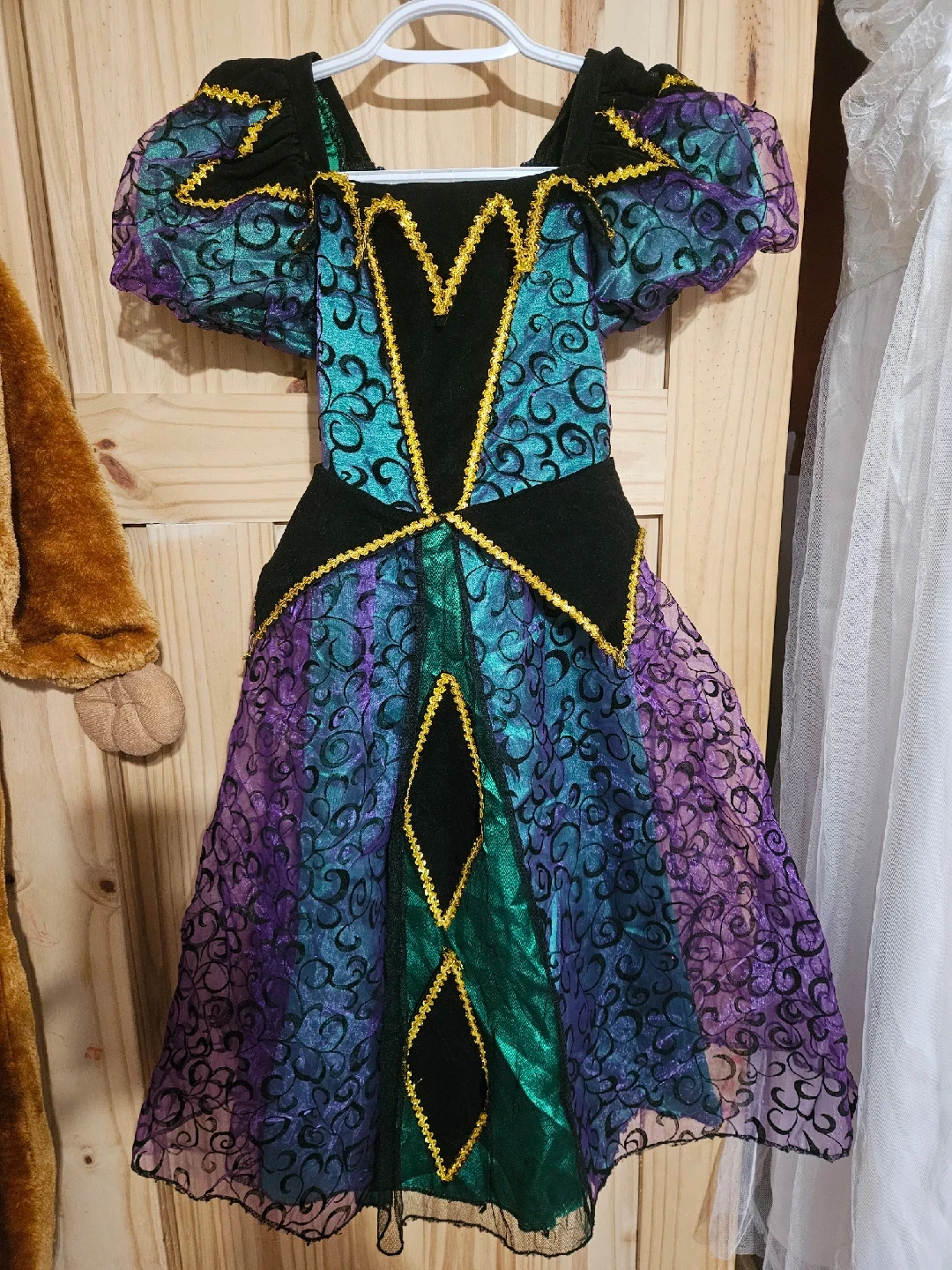 41A dress with a unique design, featuring a blend of green, purple, and black colours. It has short sleeves and gold trim details. Good for pretty witch, princess, or whatever you can imagine. Good condition, slight fray on bottom of fabric under tulle as shown in photo.