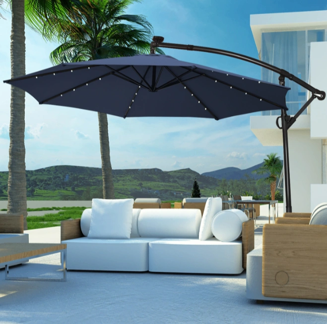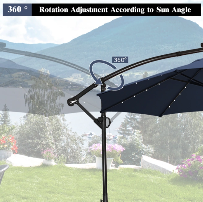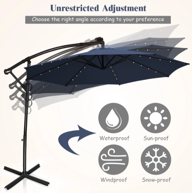99Navy - Brand new in box - $130 Price in store - $179 The luxurious outdoor patio umbrella is a good companion outdoors. Our patio offset umbrella is up to 10ft in diameter and provide a large shaded area to protect you and your family from the sun. Meanwhile, the vent at the top of the umbrella allows cool air to flow through, thus creating a comfortable environment for you.Please Note: Umbrella Base Sold Separately. About This Product 24 LED lights for perfect lighting at the night Powered by solar panels to save energy Powder-coated aluminum rod prevents rust and scratches Weather-resistant polyester fabric ensures long-term use The umbrella can freely rotate 360degreesto reach the ideal position The 10ft canopy provides a large shadow area Simple tilting system allows quick adjustment at any angle Vent design keeps air flowing Specification Material: Steel, Aluminum, Polyester fabric Overall Dimensions: 10' x7.5'(L xH) Net Weight: 30 lbs Number of Ribs: 8 Number of Lights: 24 Package includes: 1 x 10ft Solar Powered Offset Umbrella With Cross Base