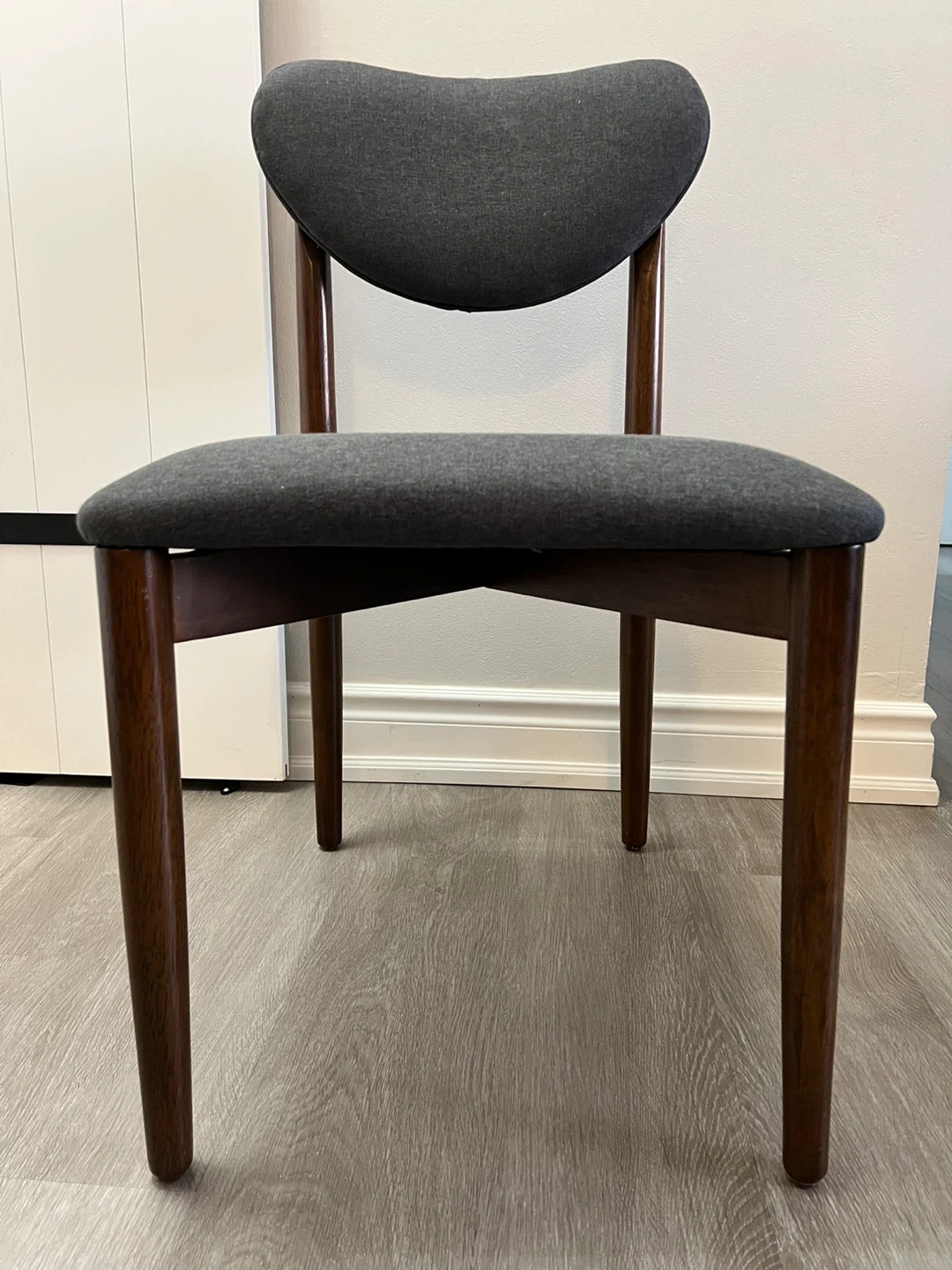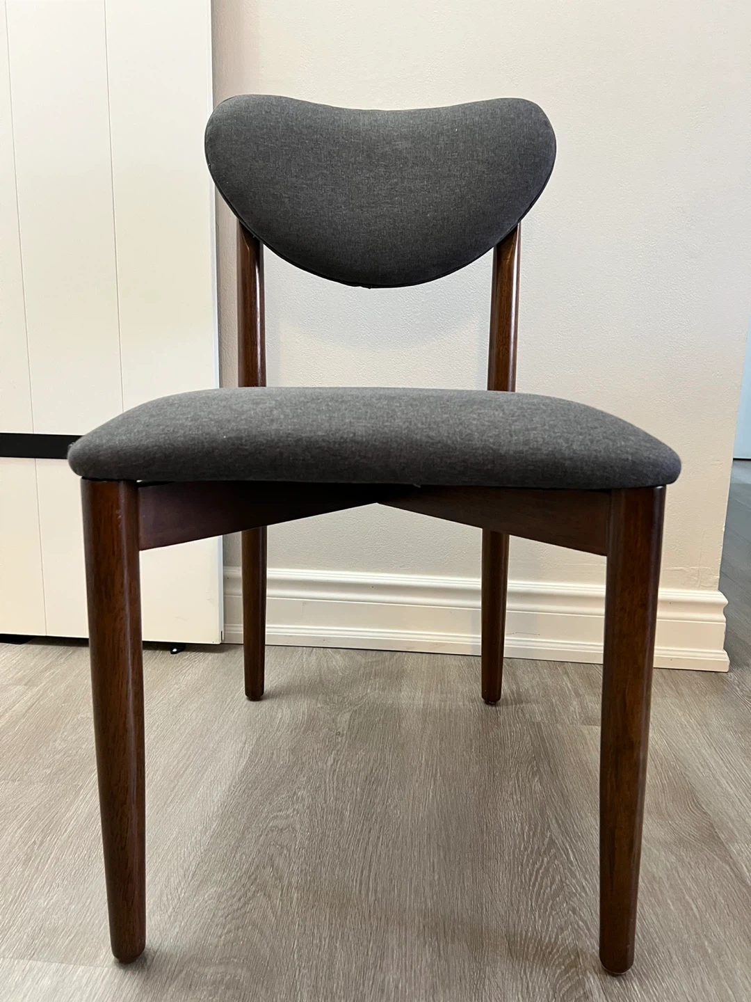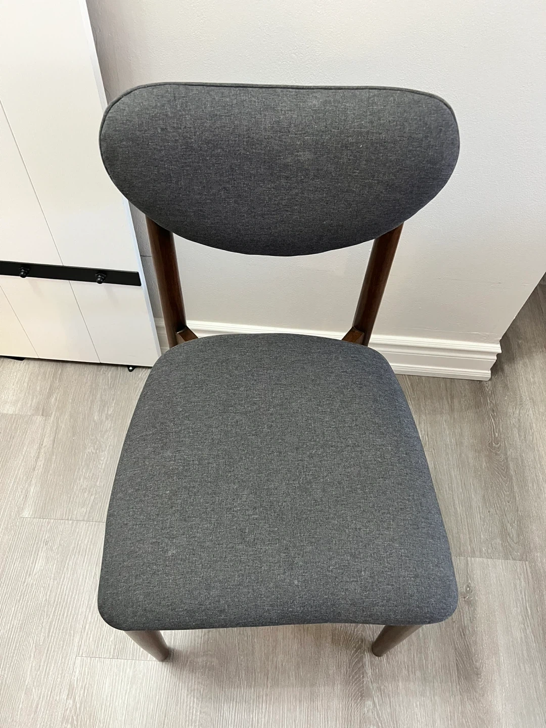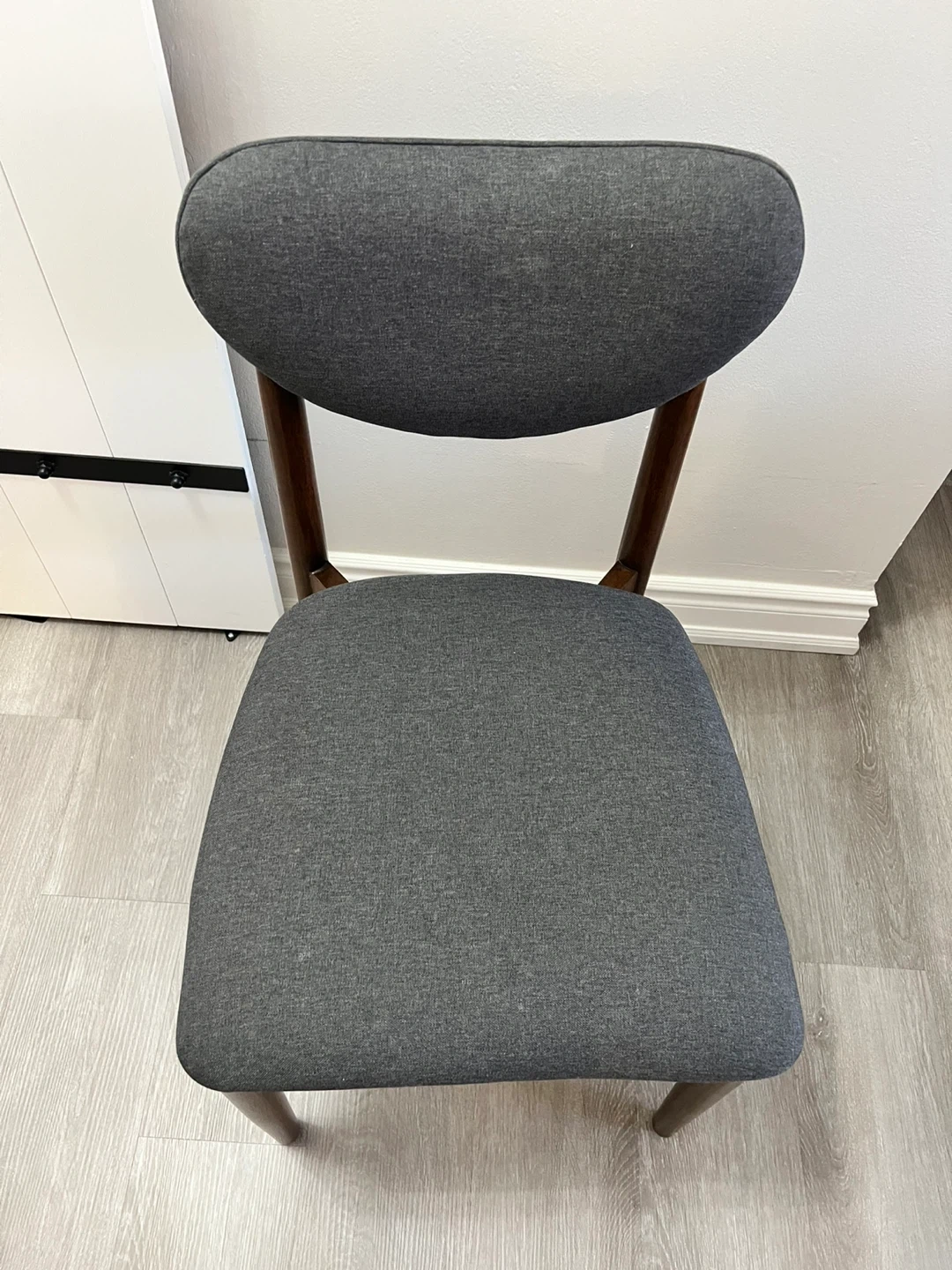 Selling a Costway upholstered dining chair in grey! It has a solid rubber wood frame and a curved backrest. Dimensions: - 18.5" wide - 29.5" back height - 19" leg height Very sturdy and quality wood. One was repaired but other 3 are in very good conditions. Asking $100 for all 4