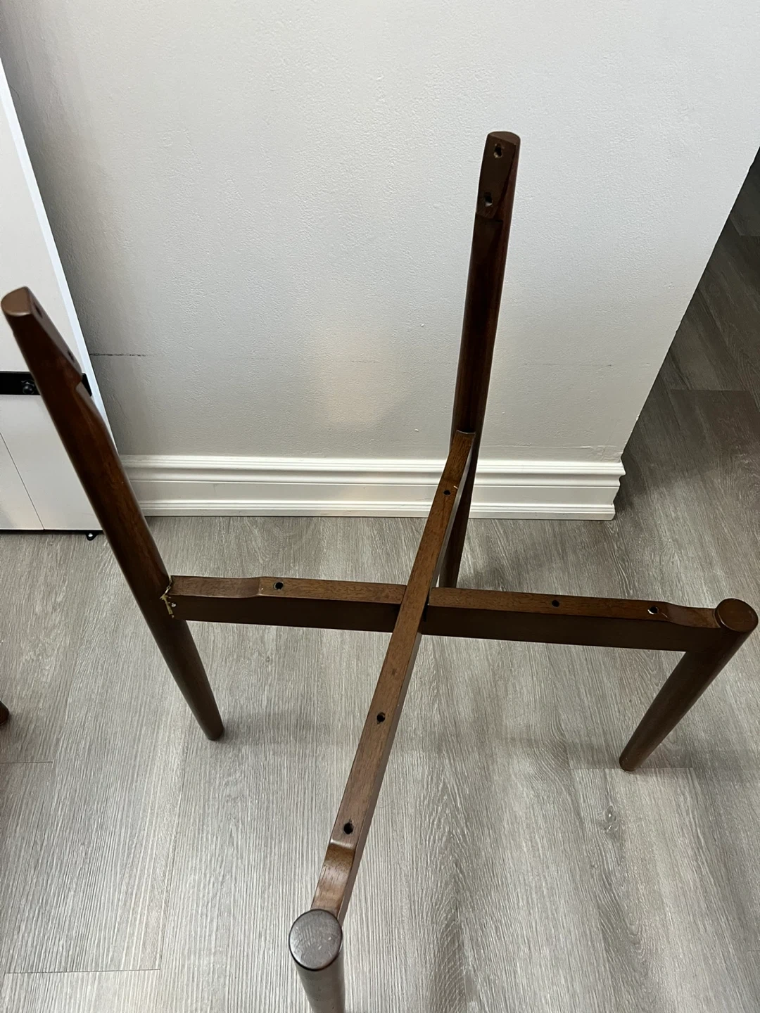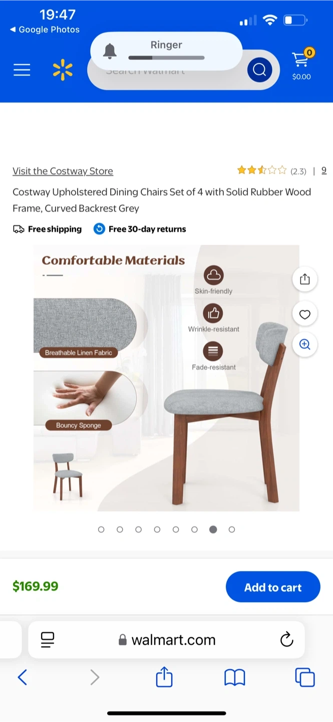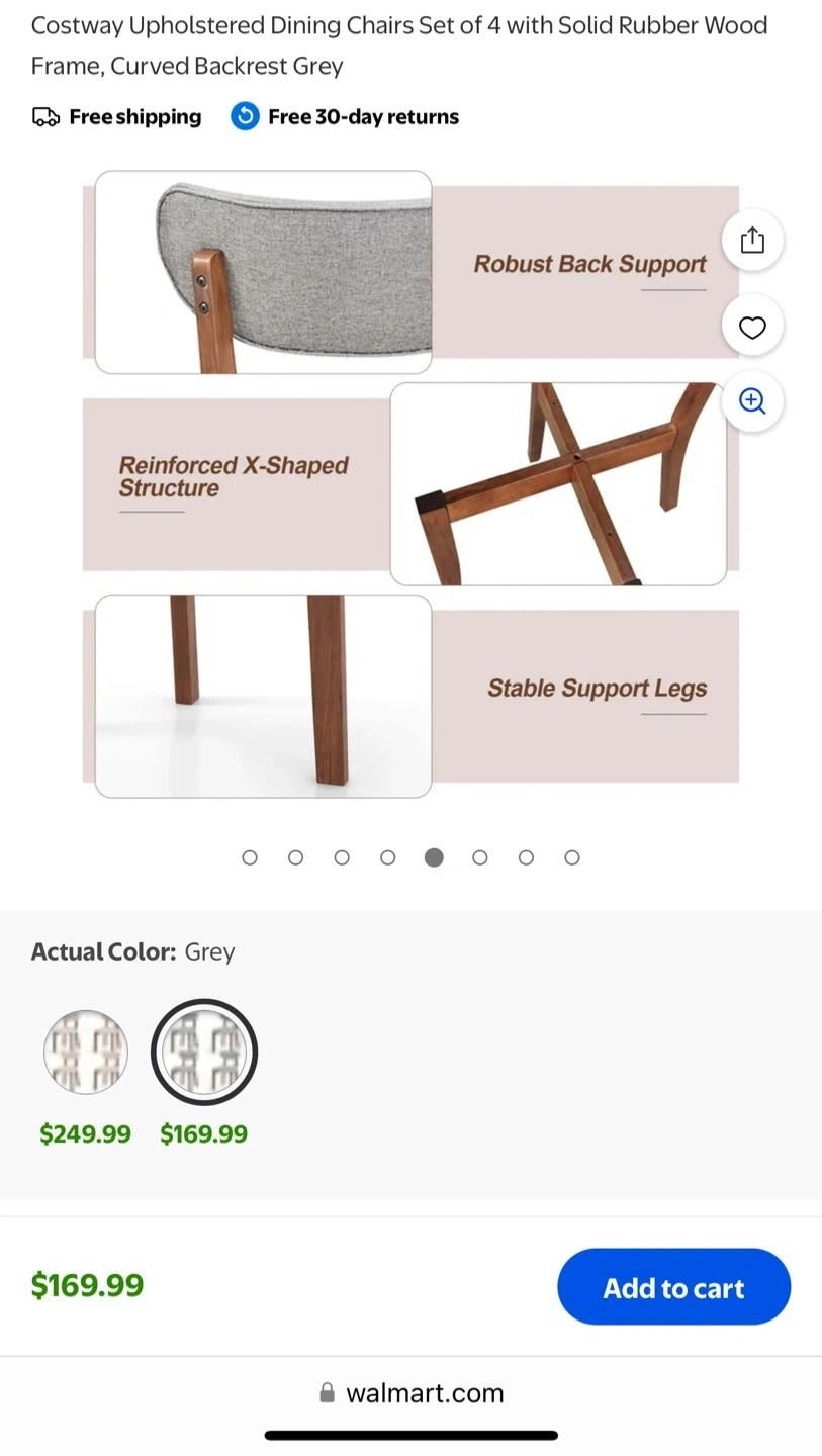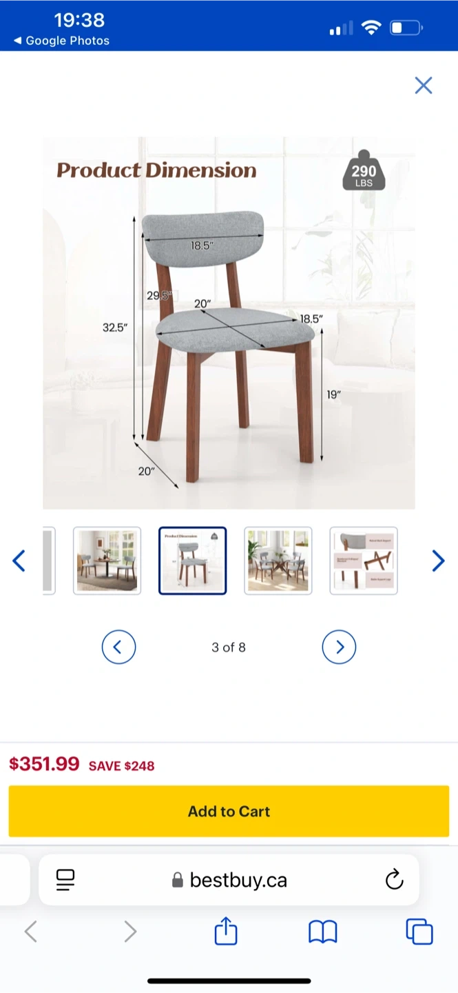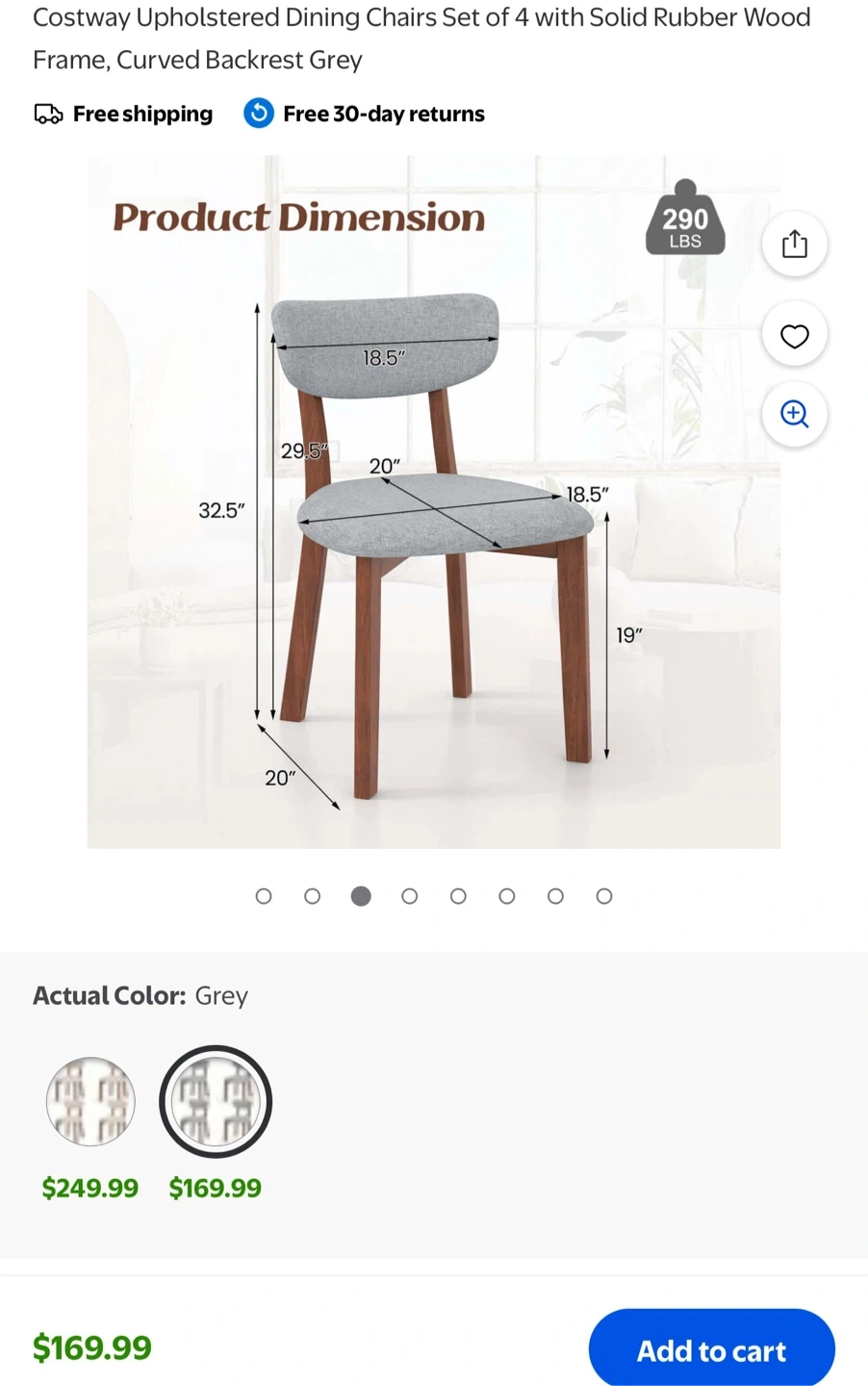 Selling a Costway upholstered dining chair in grey! It has a solid rubber wood frame and a curved backrest. Dimensions: - 18.5" wide - 29.5" back height - 19" leg height Very sturdy and quality wood. One was repaired but other 3 are in very good conditions. Asking $100 for all 4