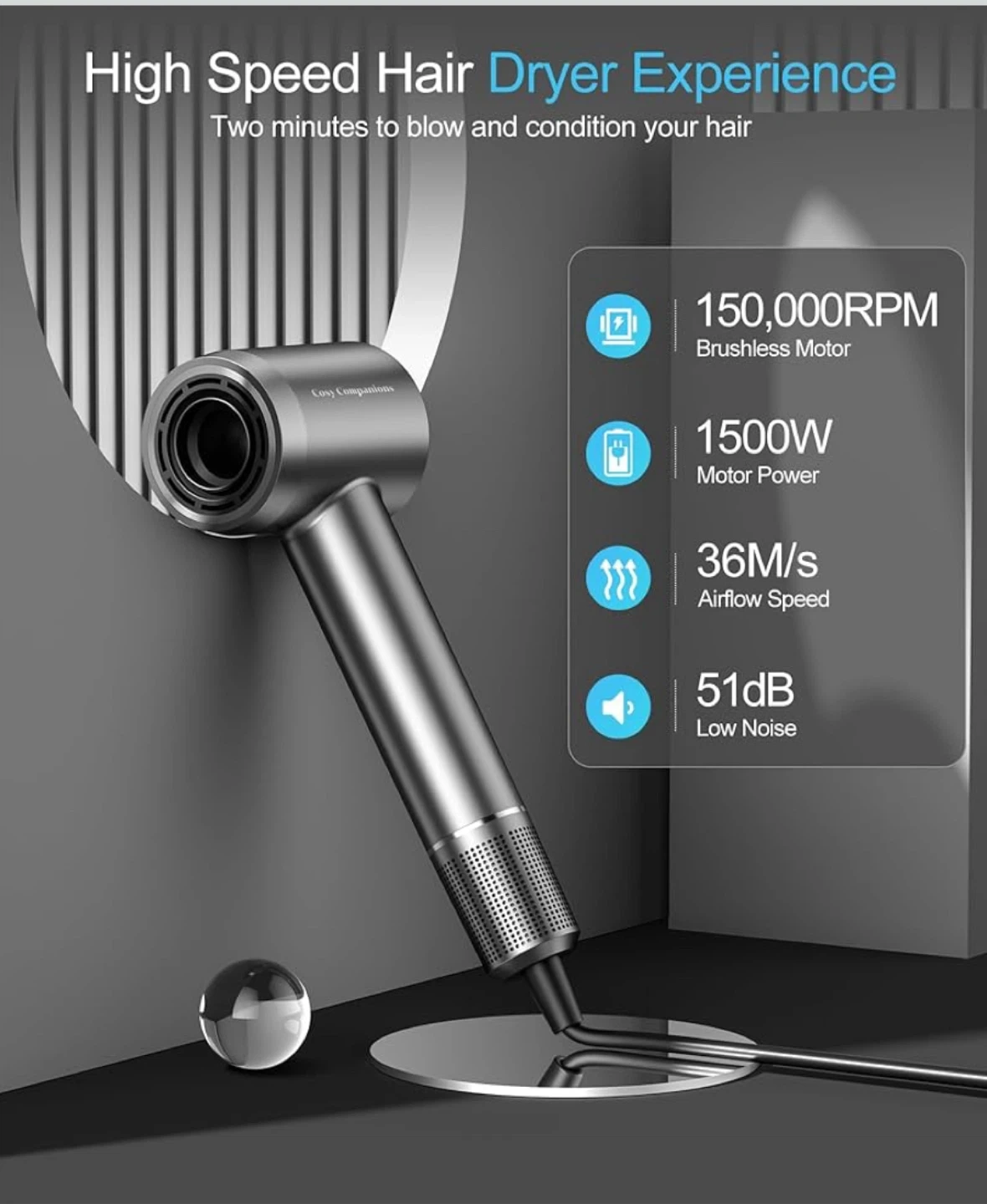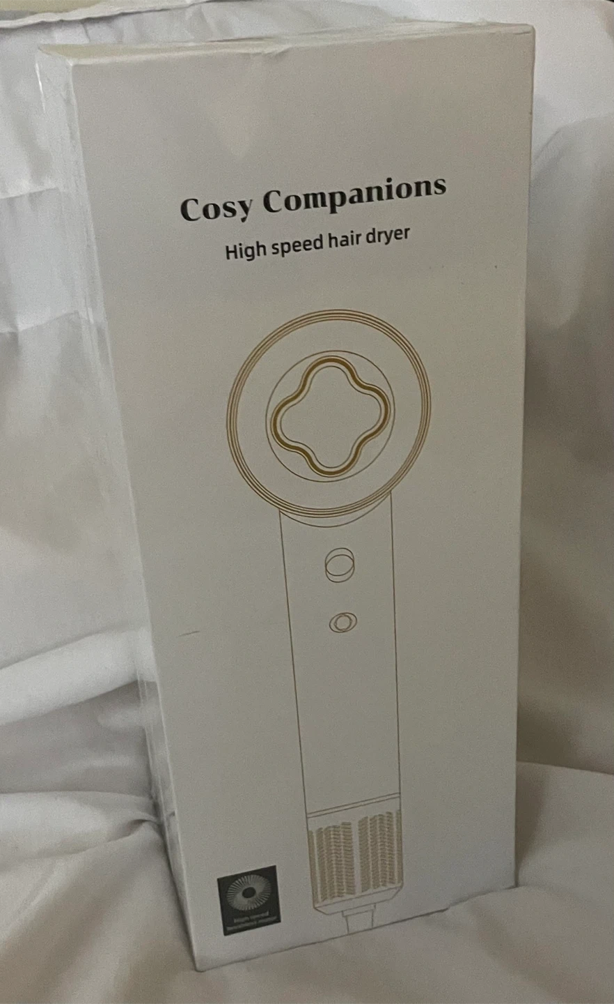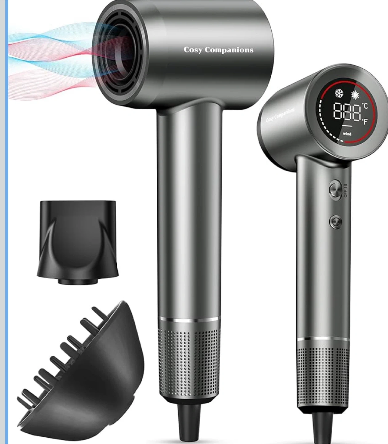 33Check out this Cosy Companions high speed hair dryer! It has a 150,000RPM brushless motor and 1500W motor power. It also features 2 styling magnetic nozzles for different hair types: a smooth nozzle and a diffuser. It's designed to reduce hair damage, cut hair drying time in half, and lock in moisture to nourish your hair