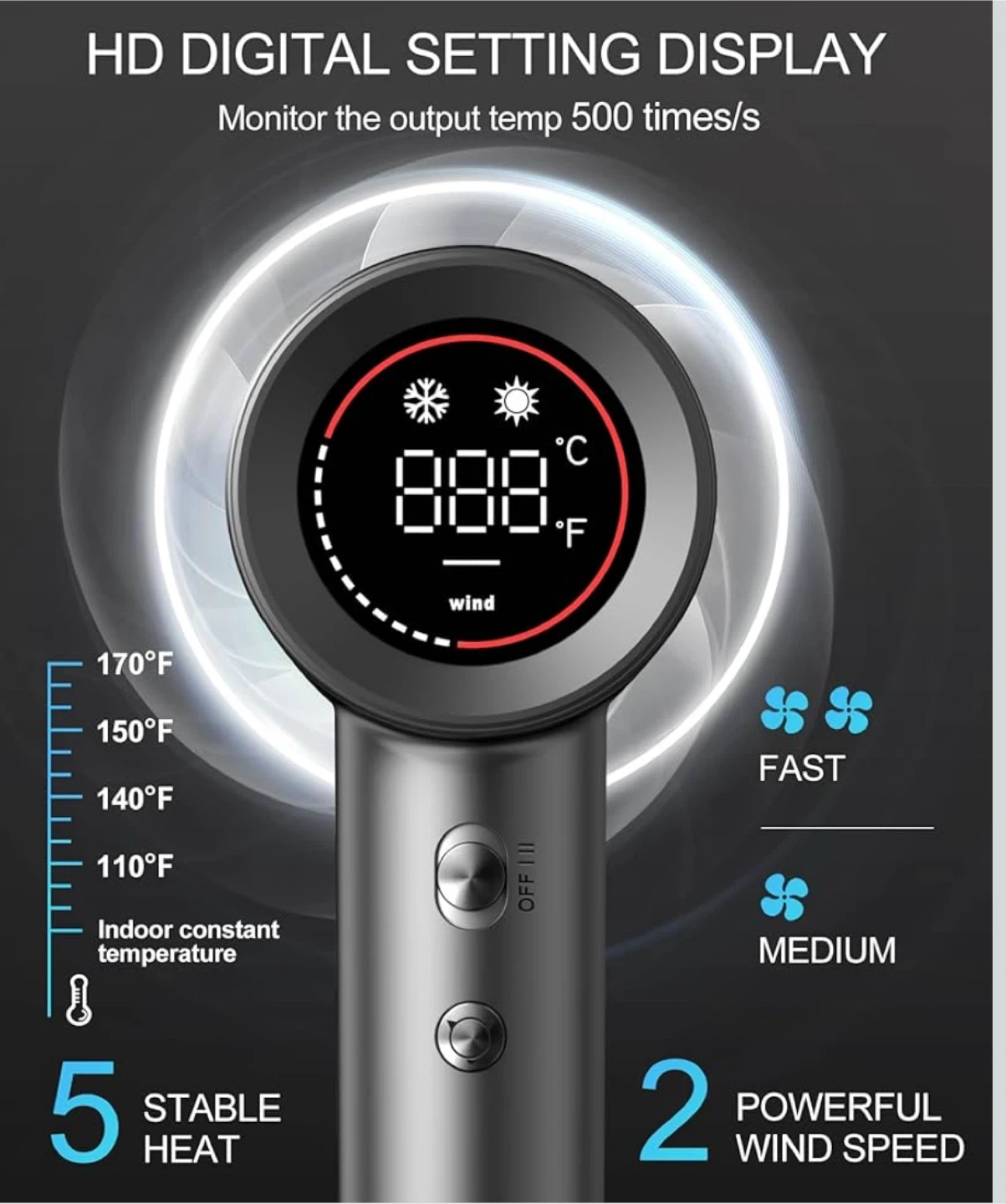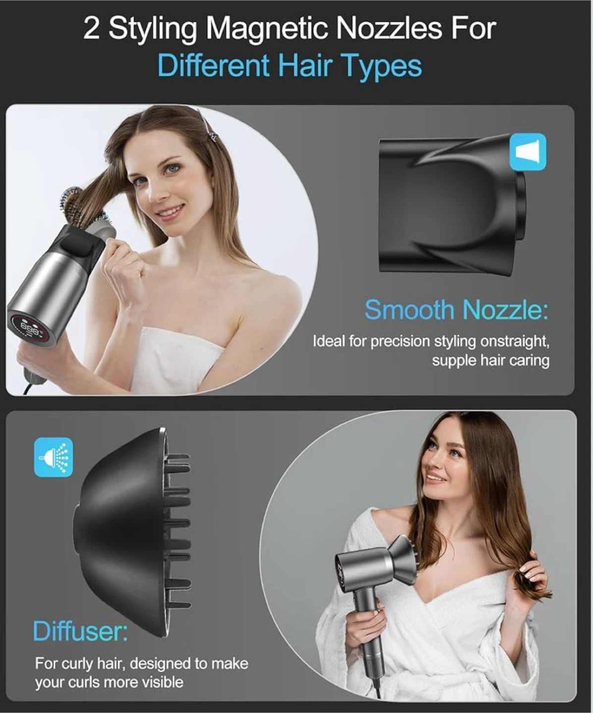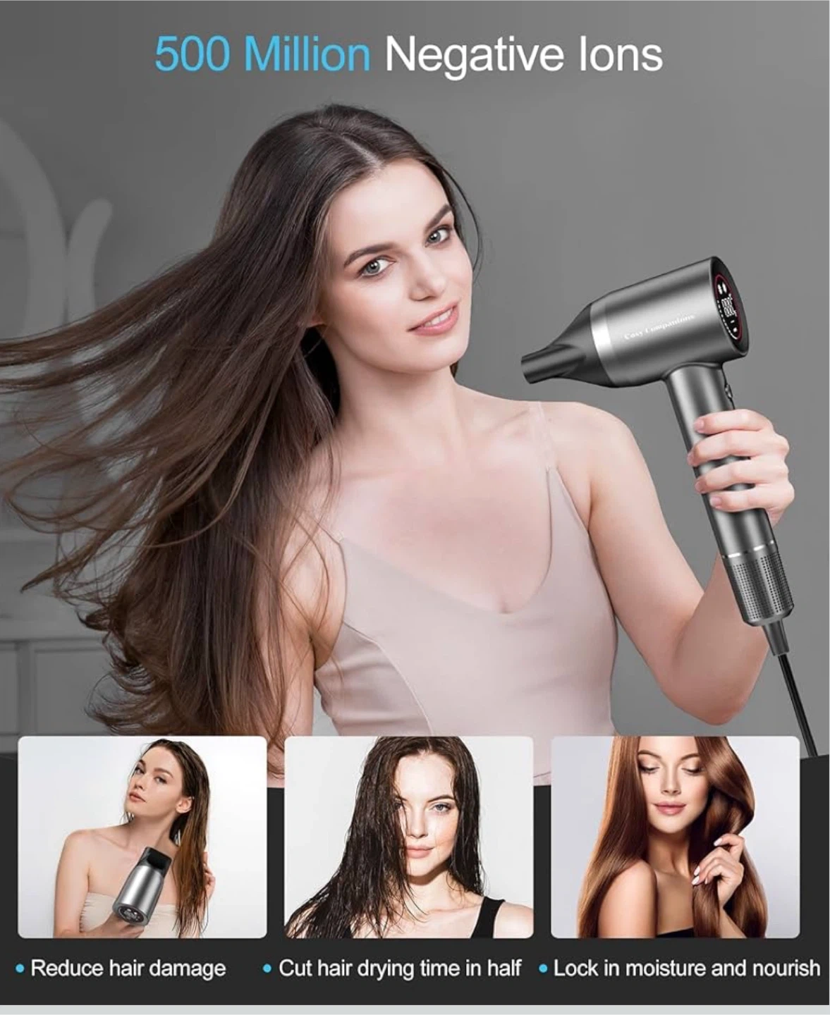 33Check out this Cosy Companions high speed hair dryer! It has a 150,000RPM brushless motor and 1500W motor power. It also features 2 styling magnetic nozzles for different hair types: a smooth nozzle and a diffuser. It's designed to reduce hair damage, cut hair drying time in half, and lock in moisture to nourish your hair