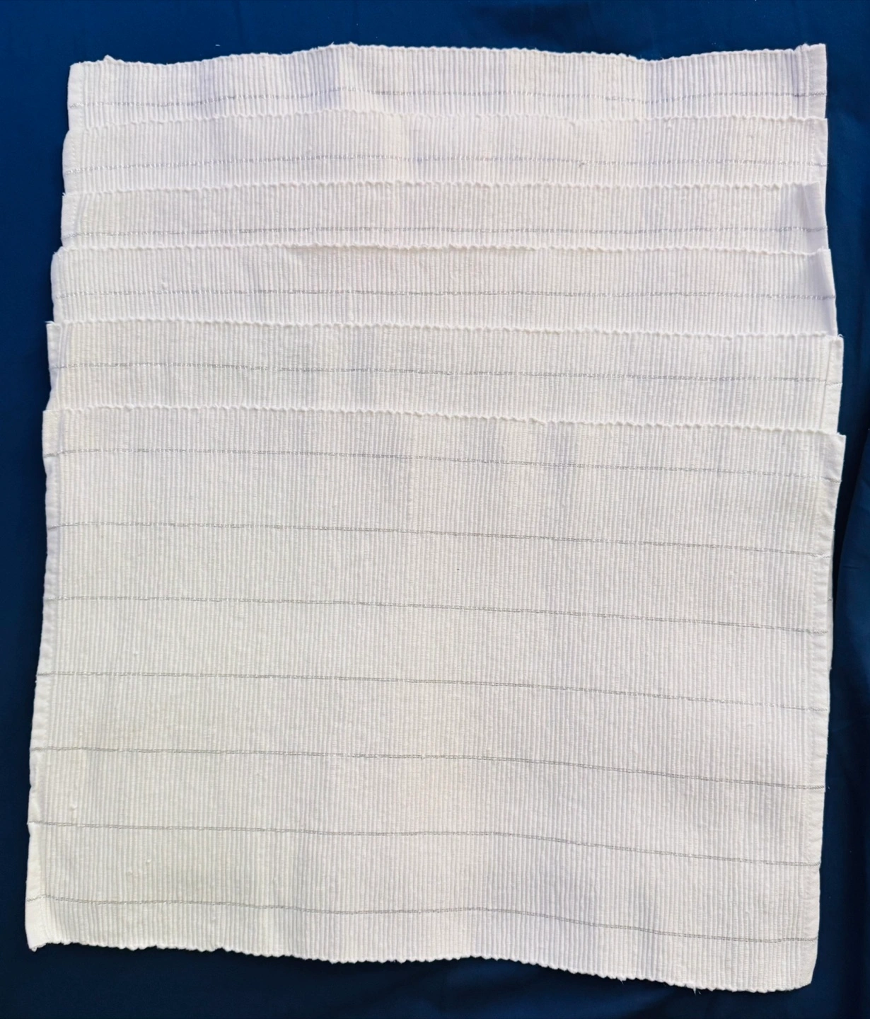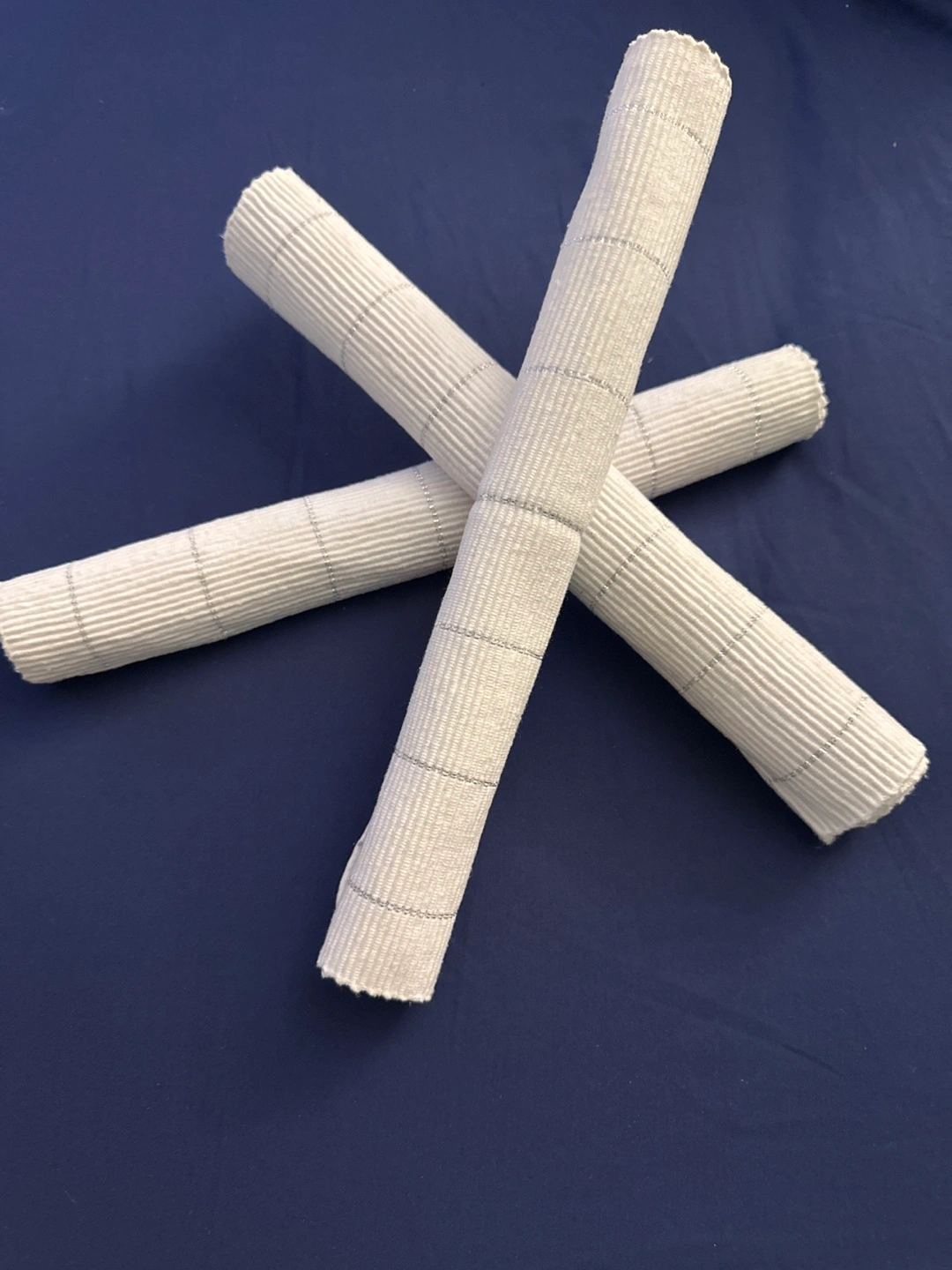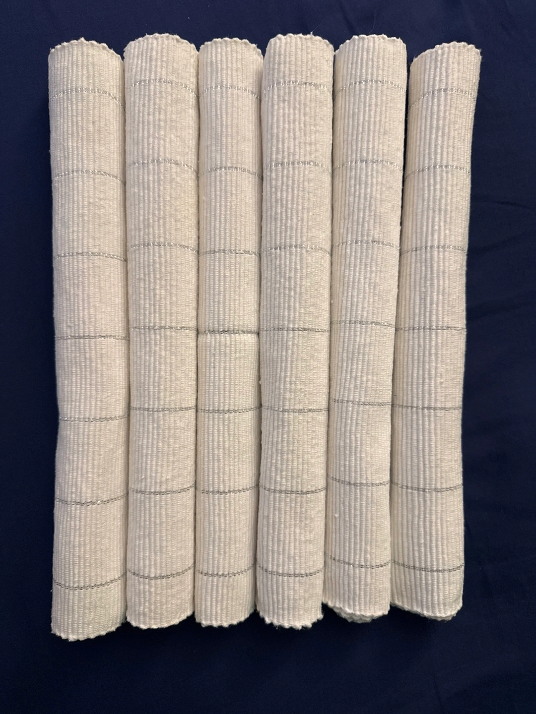 Set of six placemats, made of 98% cotton and 2% lurex! They are white with silver stripes. Perfect for adding a touch of sparkle to your table setting. Machine washable cold. - More available (lesser than perfect condition, up to +6 for a slight price adjustment if desired) Can meet at the skytrain if needed.