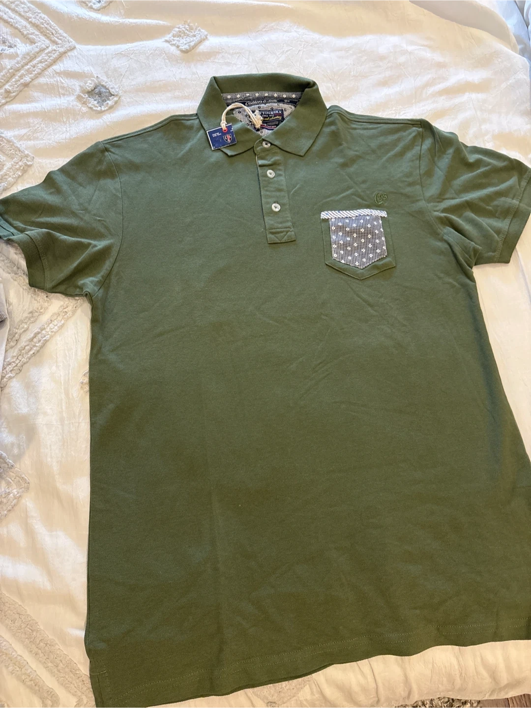 Cotton & Silk polo shirt in a nice green colour. It's an extra large size and has a unique pocket design. Perfect for a casual day out! New with tags!