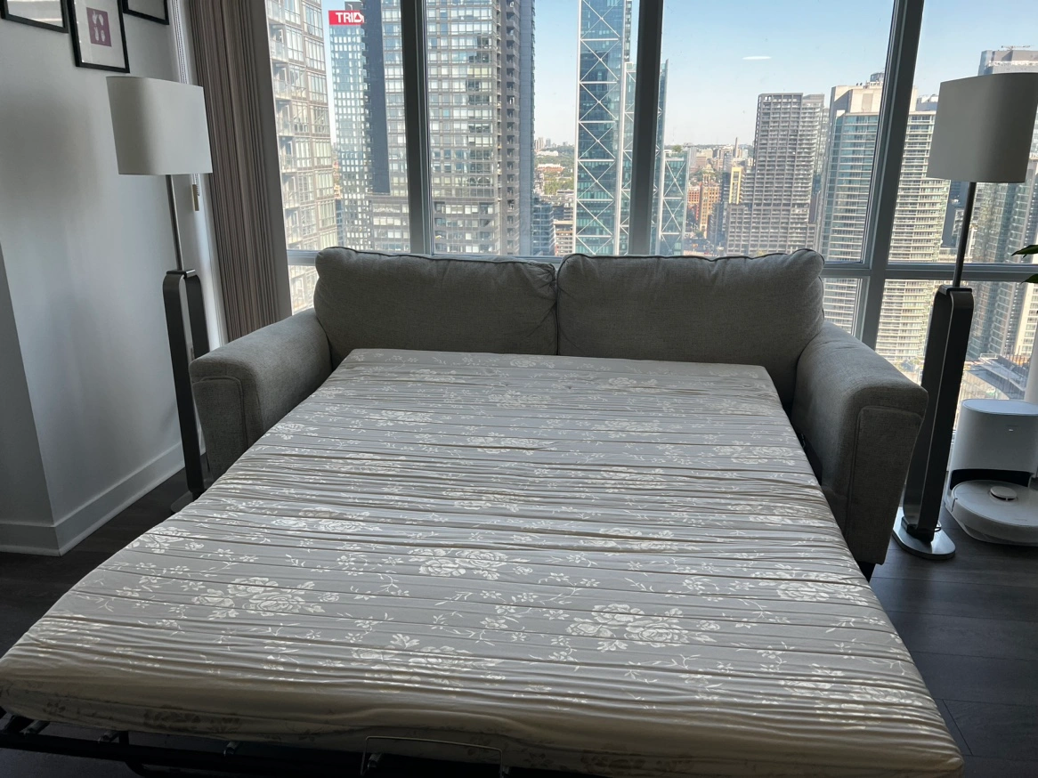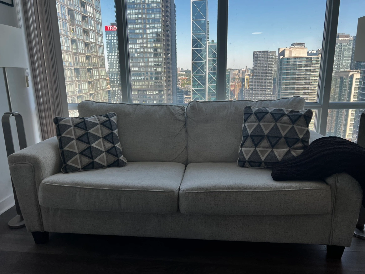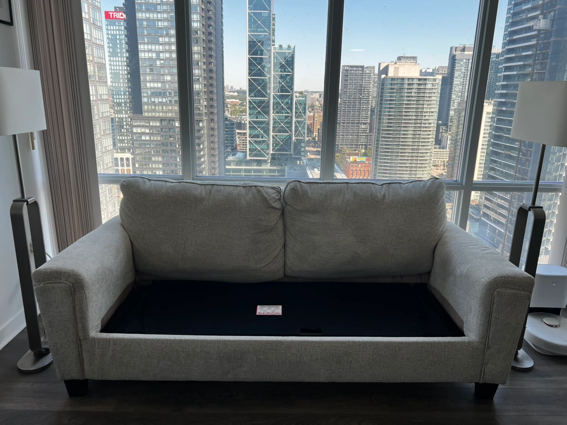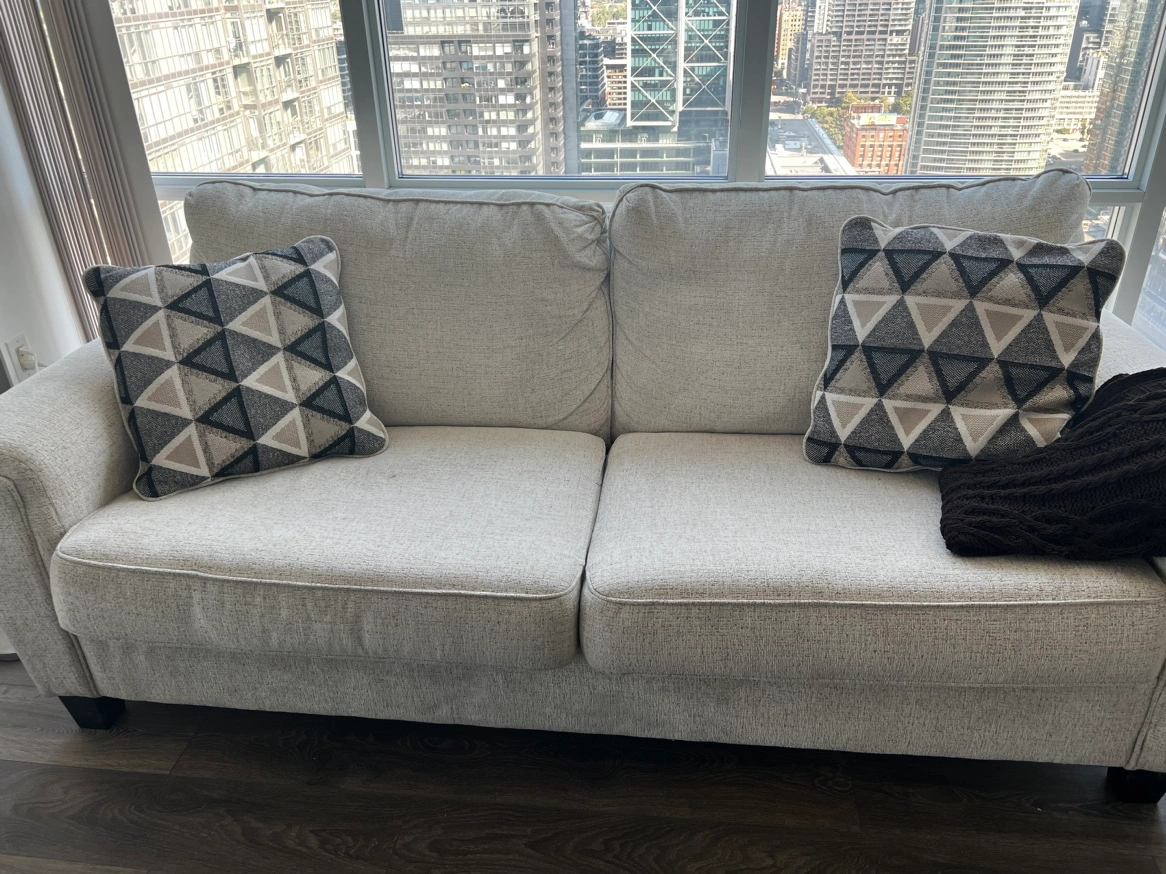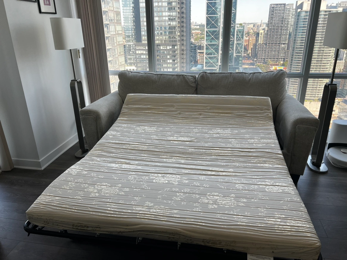 0[MOVE OUT SALE] Cream colored sofa that transforms into a queen bed when needed. Purchased new in 2023. Comes with the couch, sofa-bed mattress, cushions, and throw Dimensions = 37", 82", 20" (Couch) , Extendable to queen-sized bed Product link (closest): https://ashleyhomestore.ca/products/soletren-queen-sofa-sleeper-stone?variant=39425359708249&queryID=22fb6c76248ce09ced3ec9b8eb2383c4&objectID=39425359708249 Original purchase price: $1200