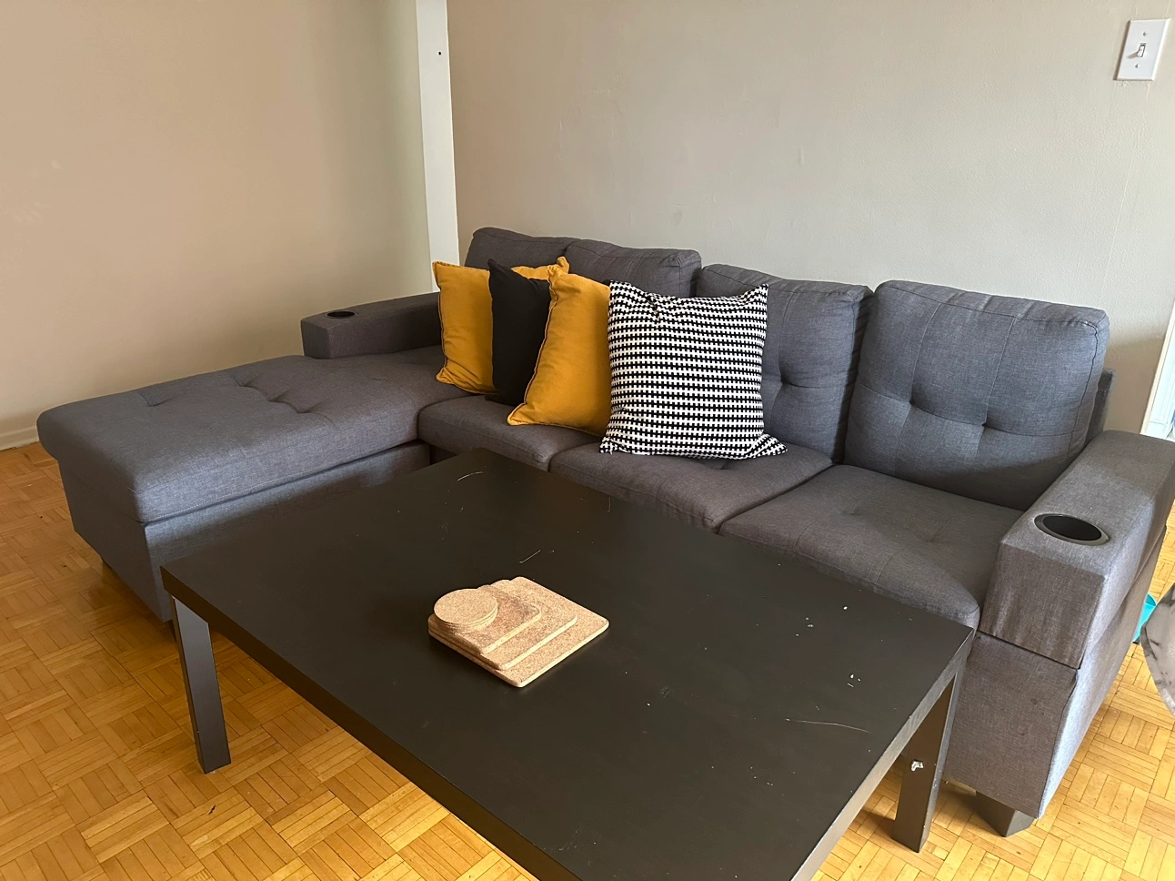 This is a grey sectional sofa with a chaise lounge. It includes two cup holders. The price includes the coffee table as well.