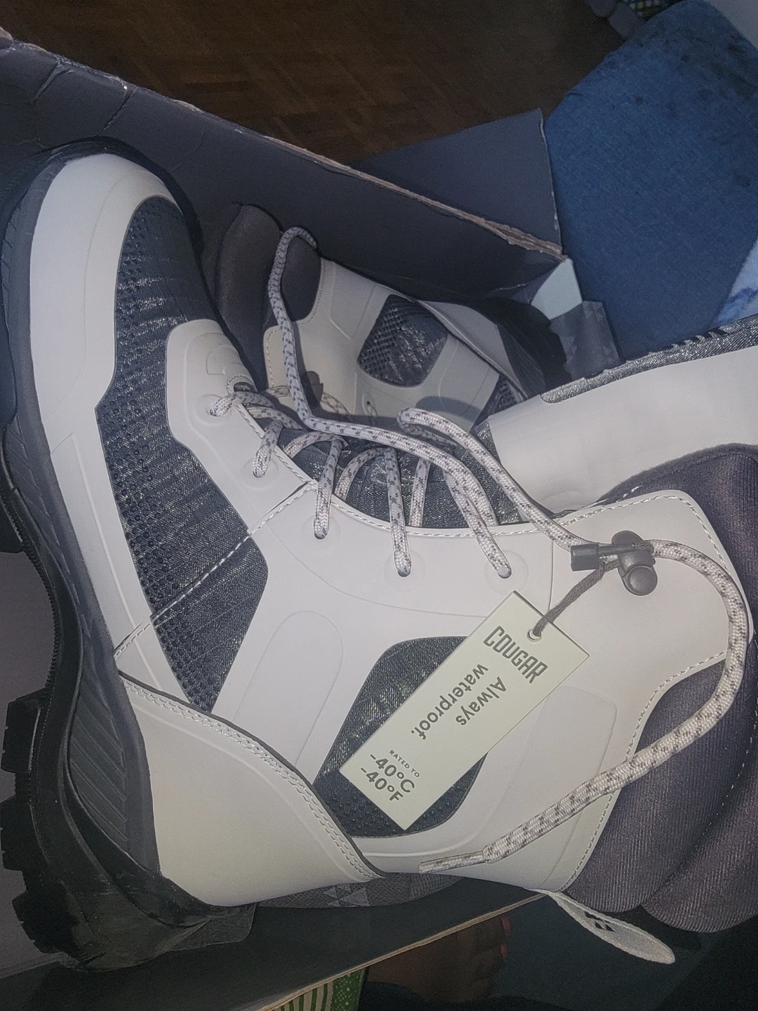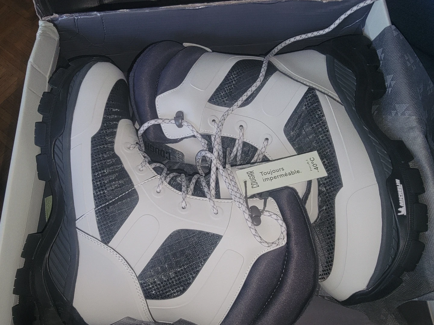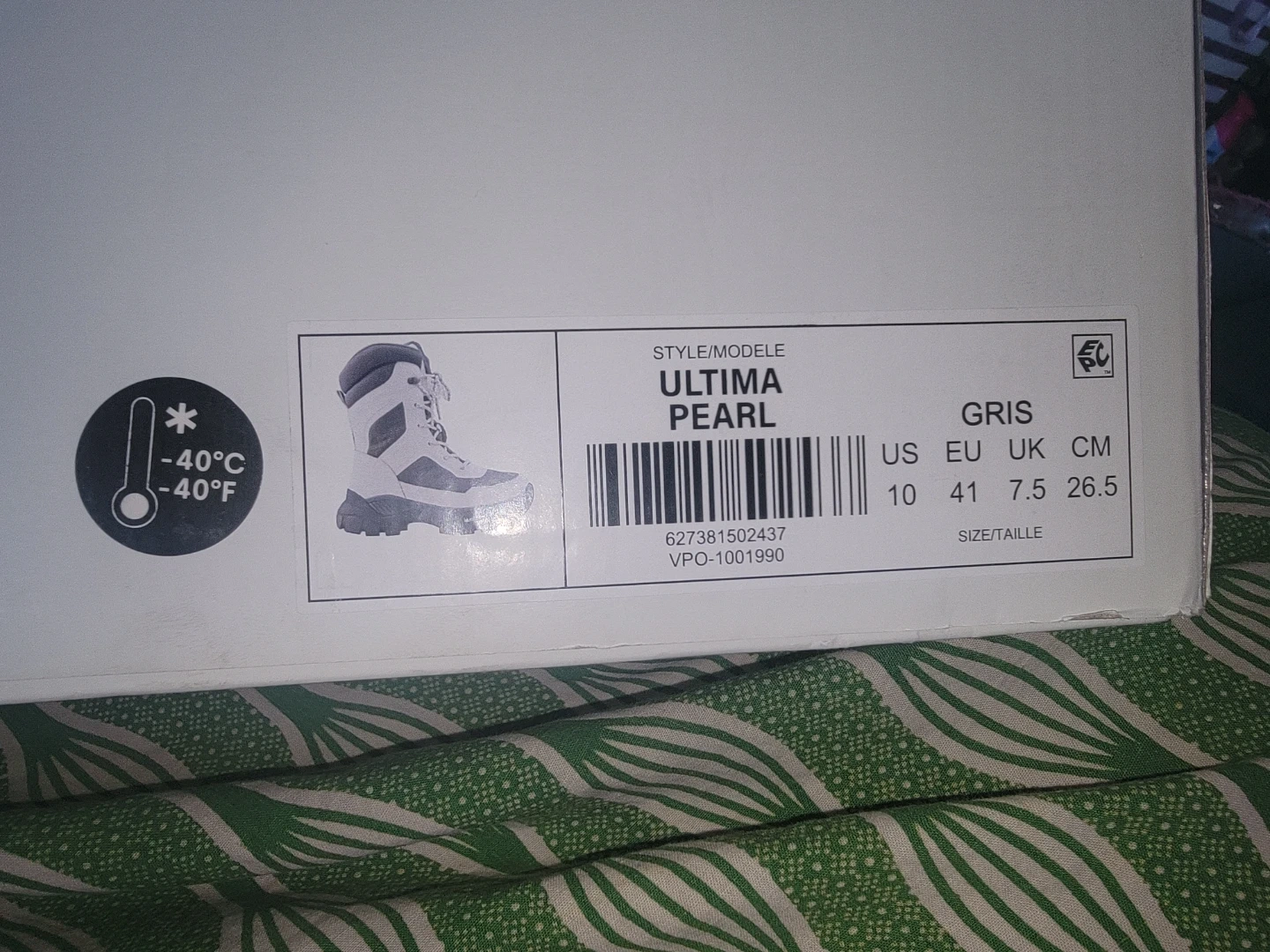 54Selling a pair of Cougar Ultima Pearl winter boots in size 10. These boots are white and black and are waterproof to -40°C. They come in the original box and originally retailed for $189.99.They have never been worn
