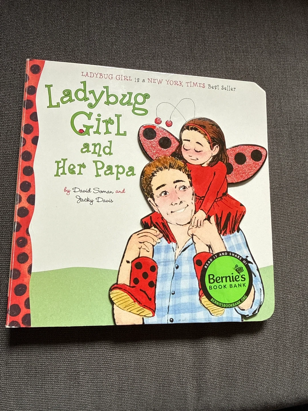 This is the children's book 'Ladybug Girl and Her Papa.' It's a New York Times Best Seller written by David Soman and Jacky Davis. Bernie's Book Bank is a program that encourages reading.