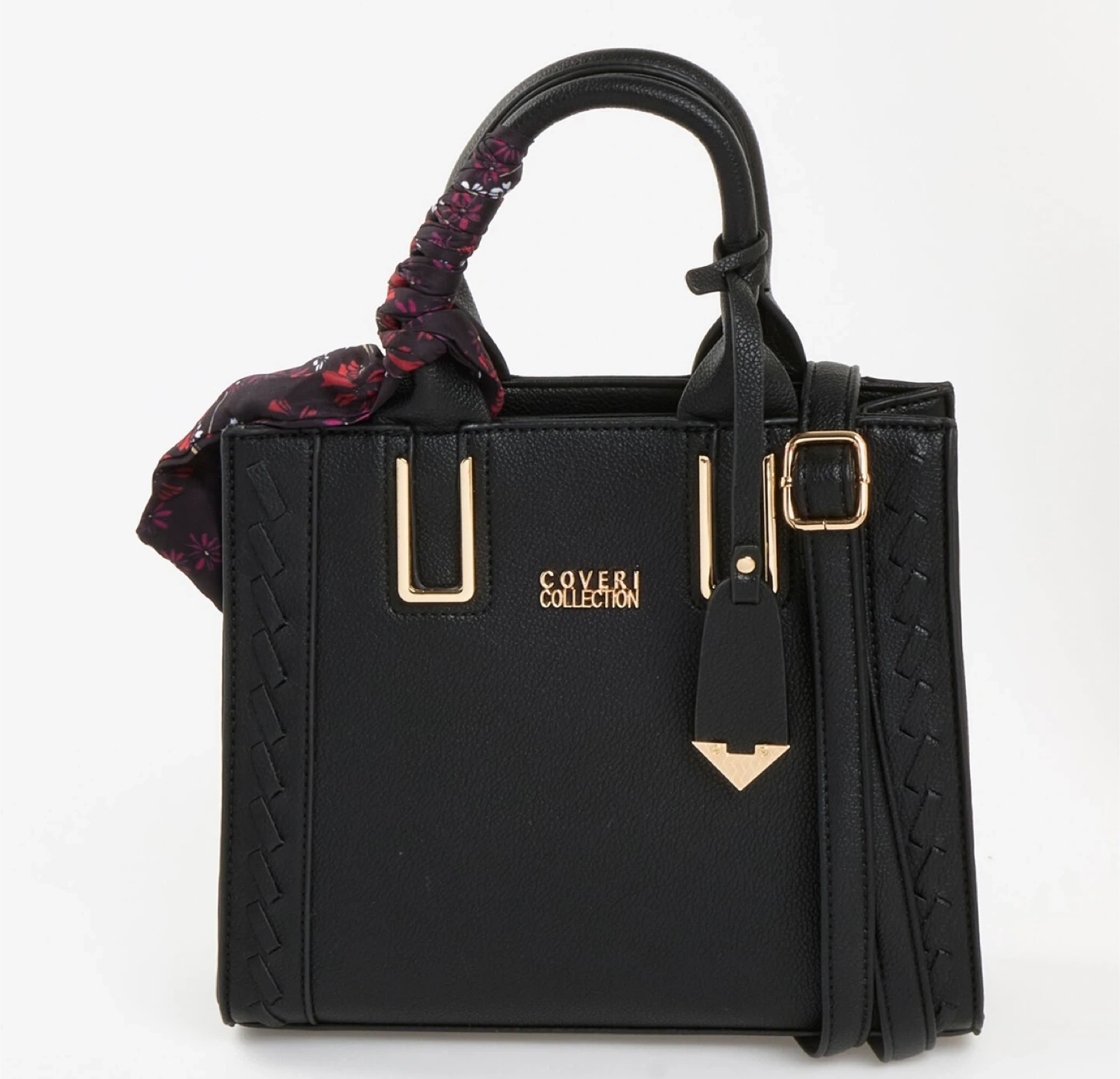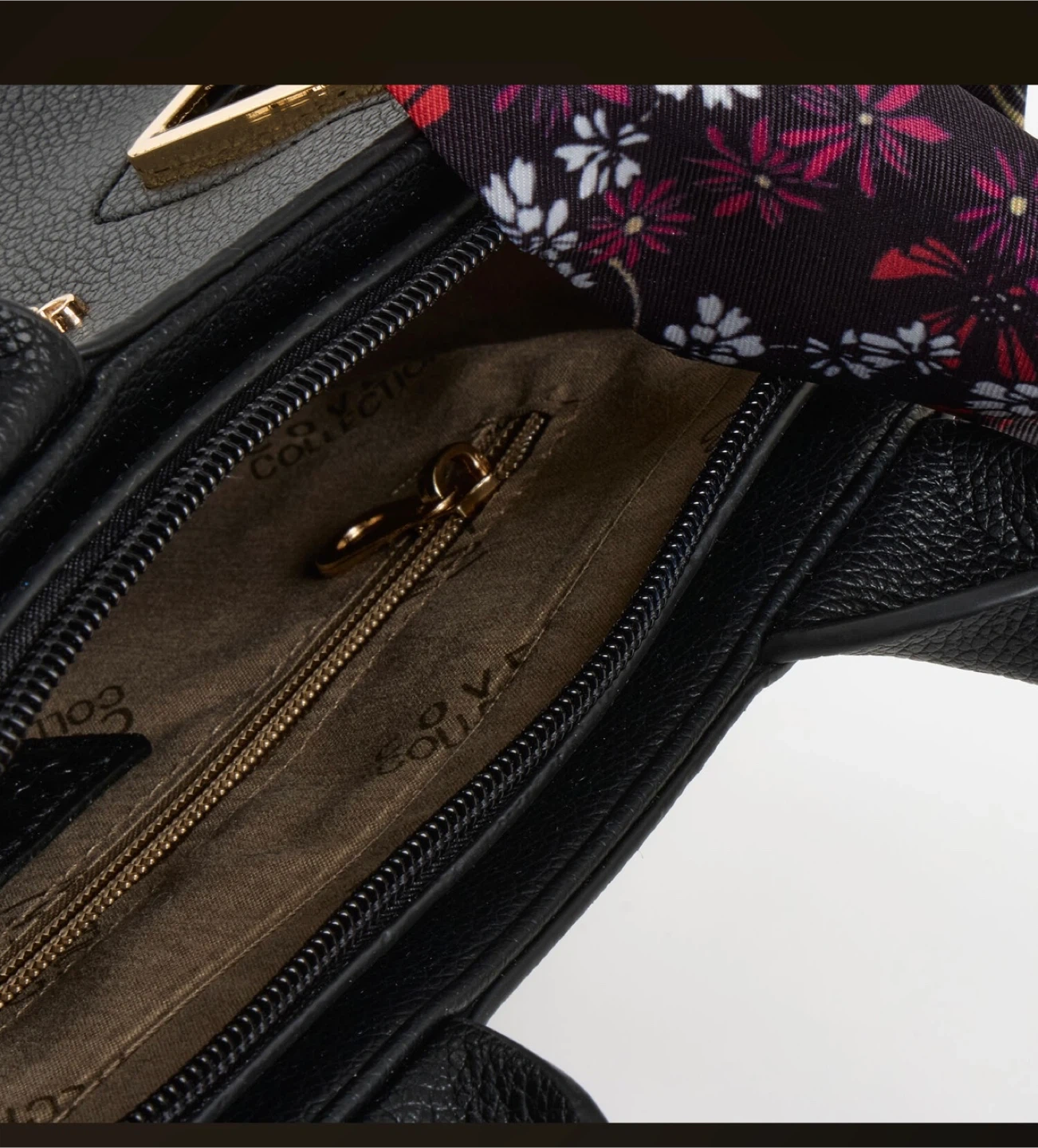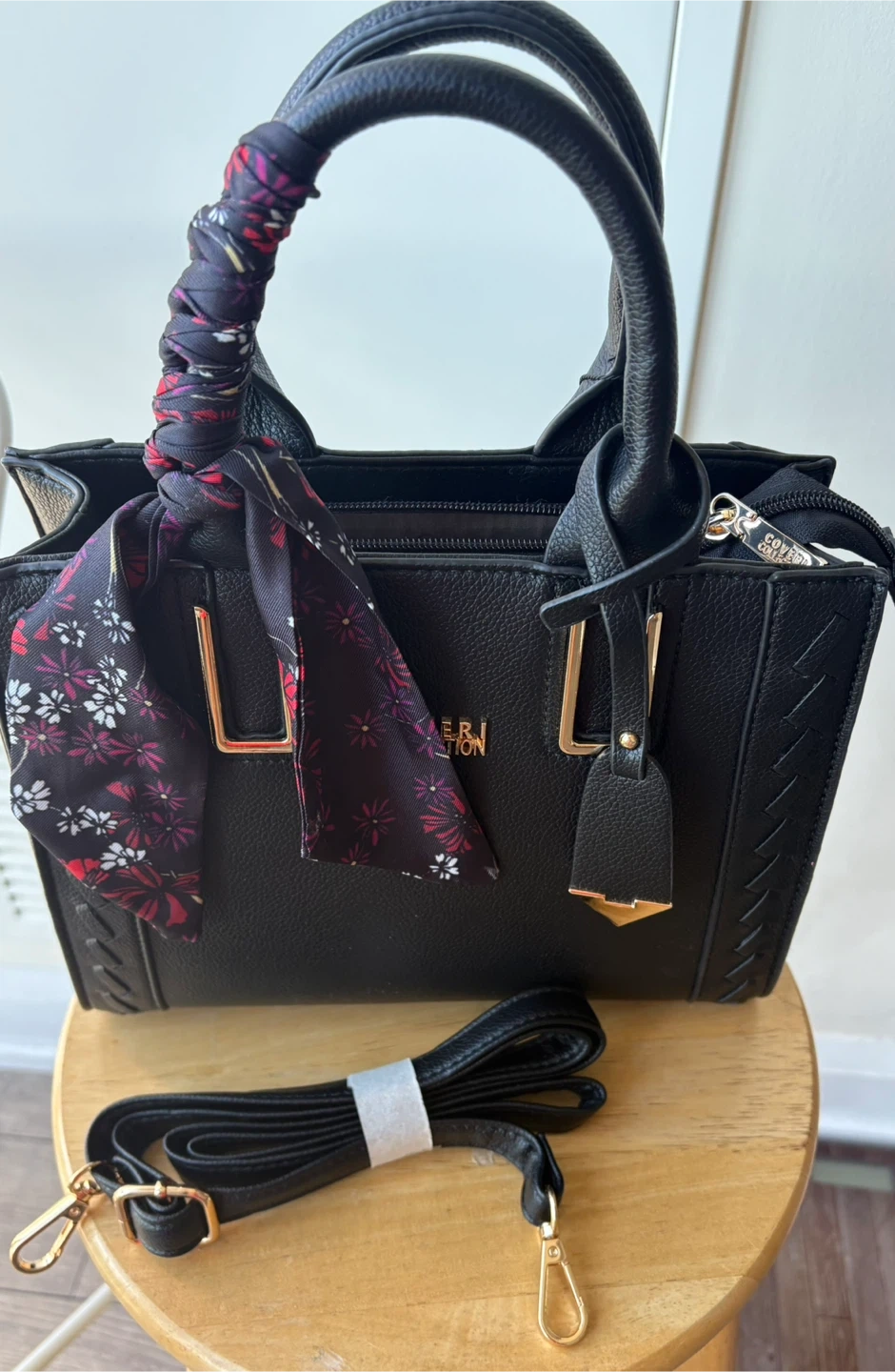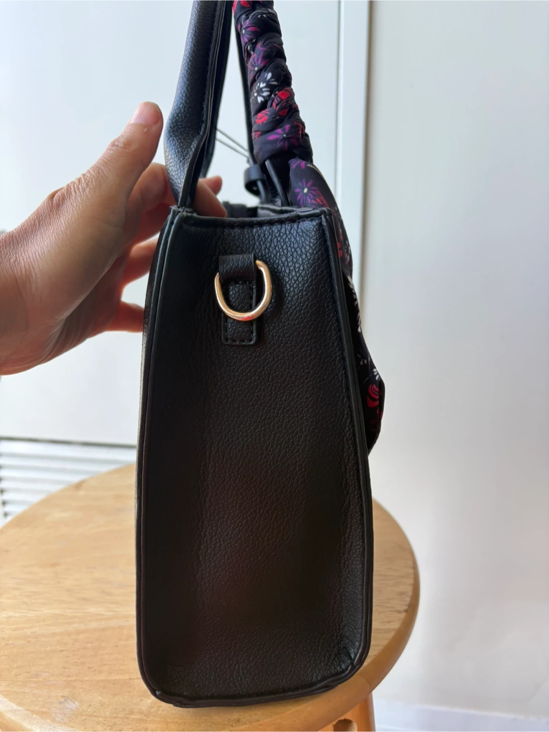 85Brand new a stylish black handbag from It comes with a cute floral scarf tied to the handle, adding a touch of elegance. Also includes a detachable shoulder strap for versatility. Perfect for everyday use! Feel free to also check my other listings make a bundle with discount. #bag #handbag #brand new #black