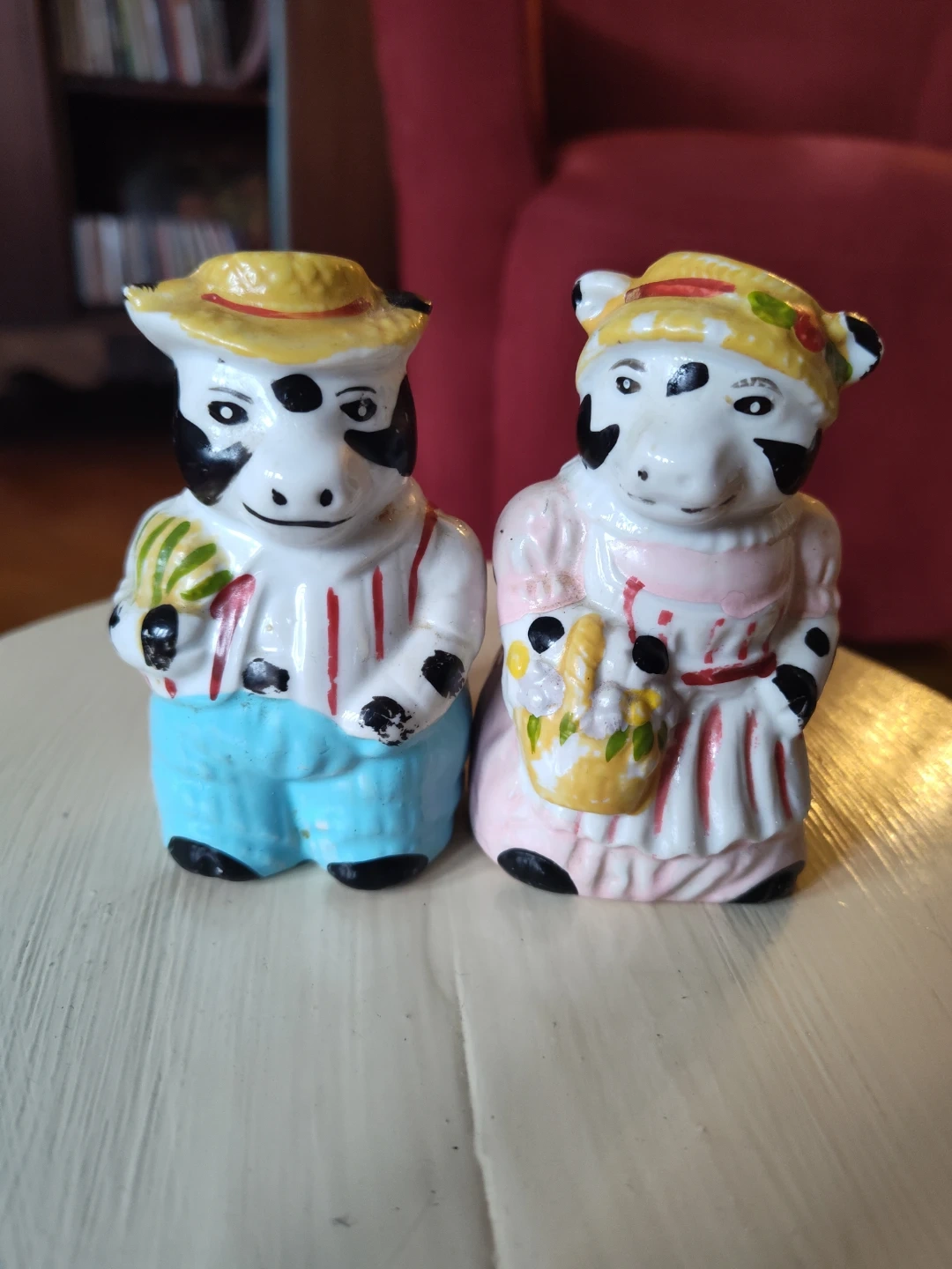 A cute pair of ceramic cow salt and pepper shakers. The male cow wears blue pants and a straw hat, holding some greens. The female cow wears a pink dress and a bonnet, holding a basket of flowers. They're a charming addition to any kitchen table!