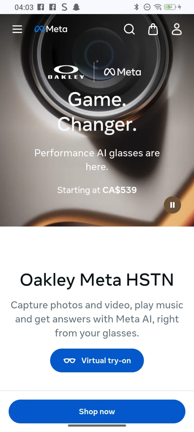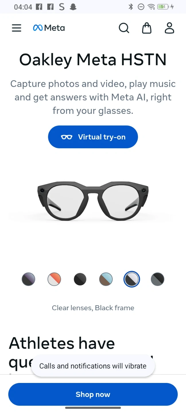 Oakley Meta HSTN smart glasses let you capture photos and video, play music, and get answers with Meta AI. These glasses have a black frame with clear lenses. Calls and notifications will vibrate.