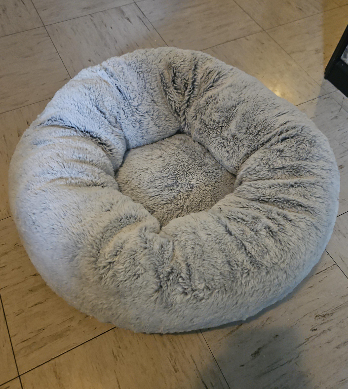 This is a super comfy donut-shaped pet bed! It's a soft, plushy grey colour, perfect for cats or small dogs who love to curl up. It's in great condition and ready for a new furry friend to enjoy!
