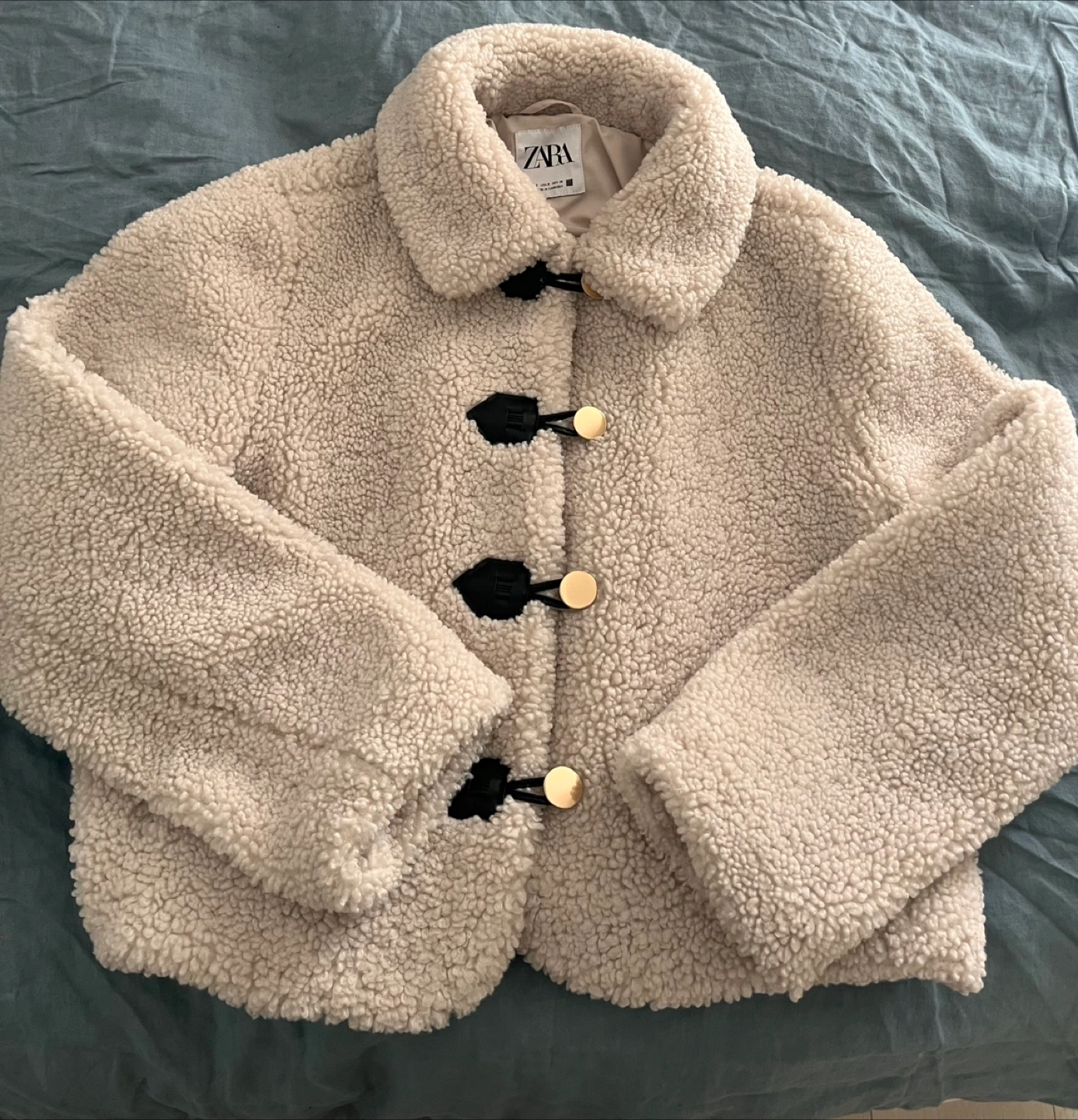 This jacket is perfect for a cold day. The jacket is off-white. It features black clasps and golden buttons. There is a large collar, and the sleeves are long. Pockets are fake!