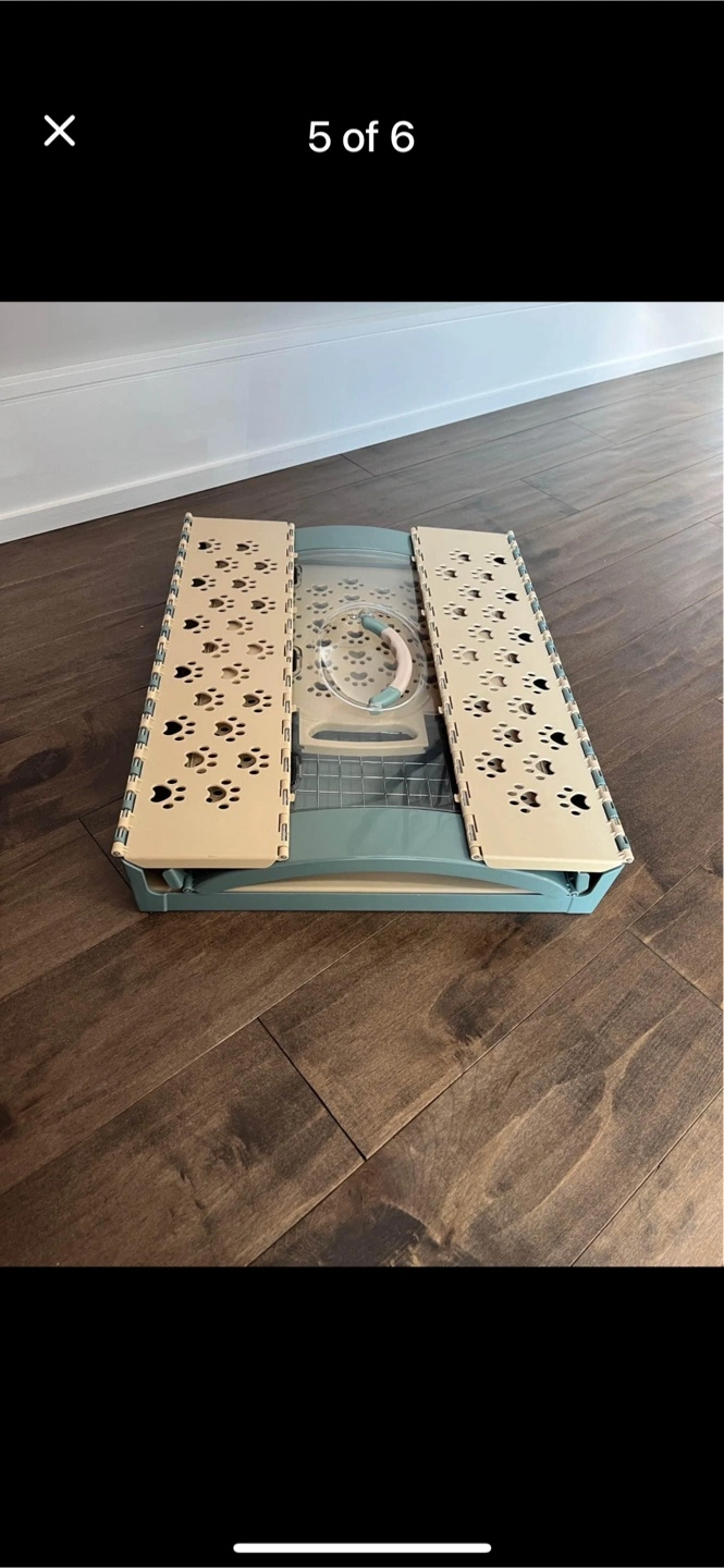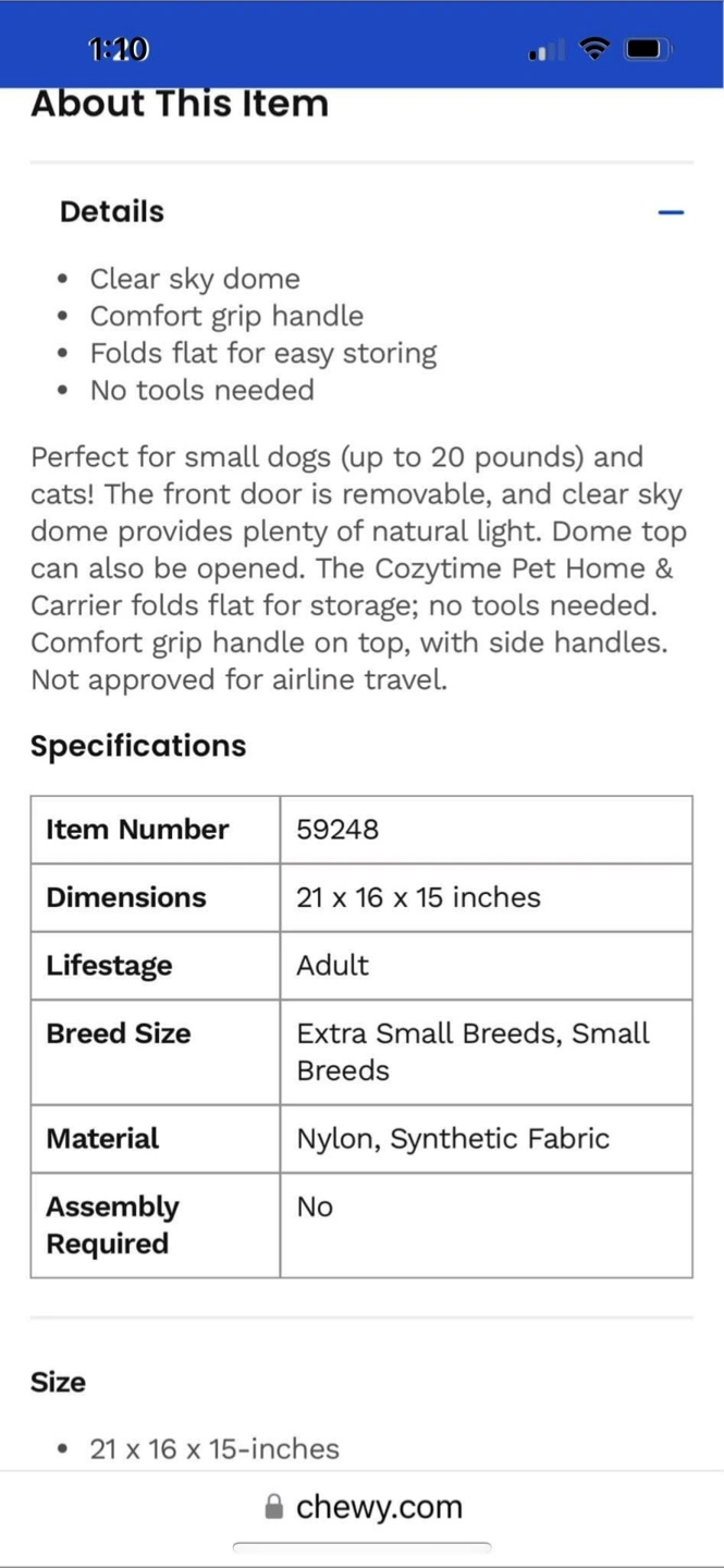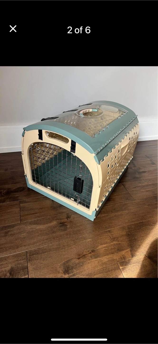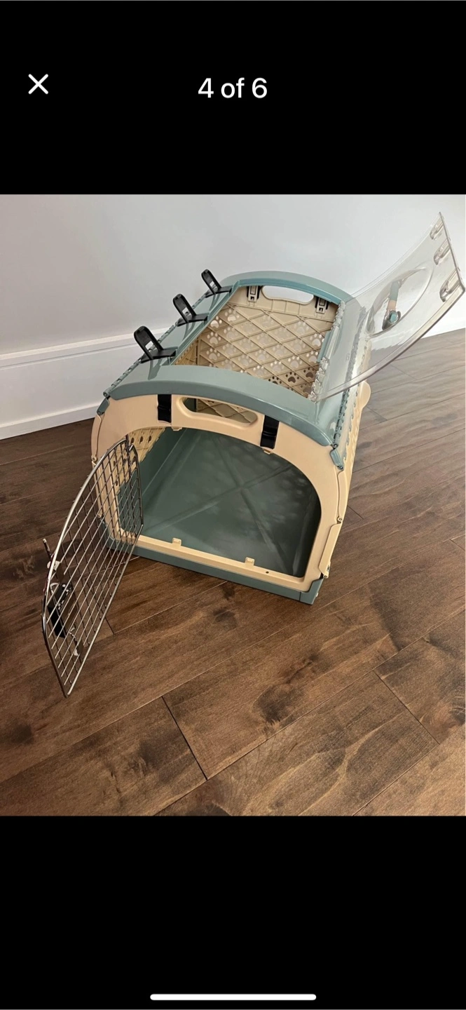 Selling a Cozytime Pet Home & Carrier! It's perfect for small dogs (up to 20 pounds) and cats. Key features: - Clear sky dome - Comfort grip handle - Folds flat for easy storing - No tools needed Dimensions are 21 x 16 x 15 inches. Made of nylon and synthetic fabric