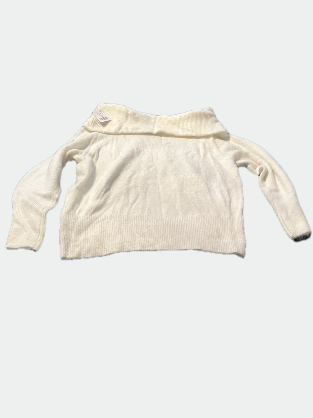 Cozy white sweater with a cowl neck. It's made with a soft, fuzzy material. Looks great for casual wear or dressing up!