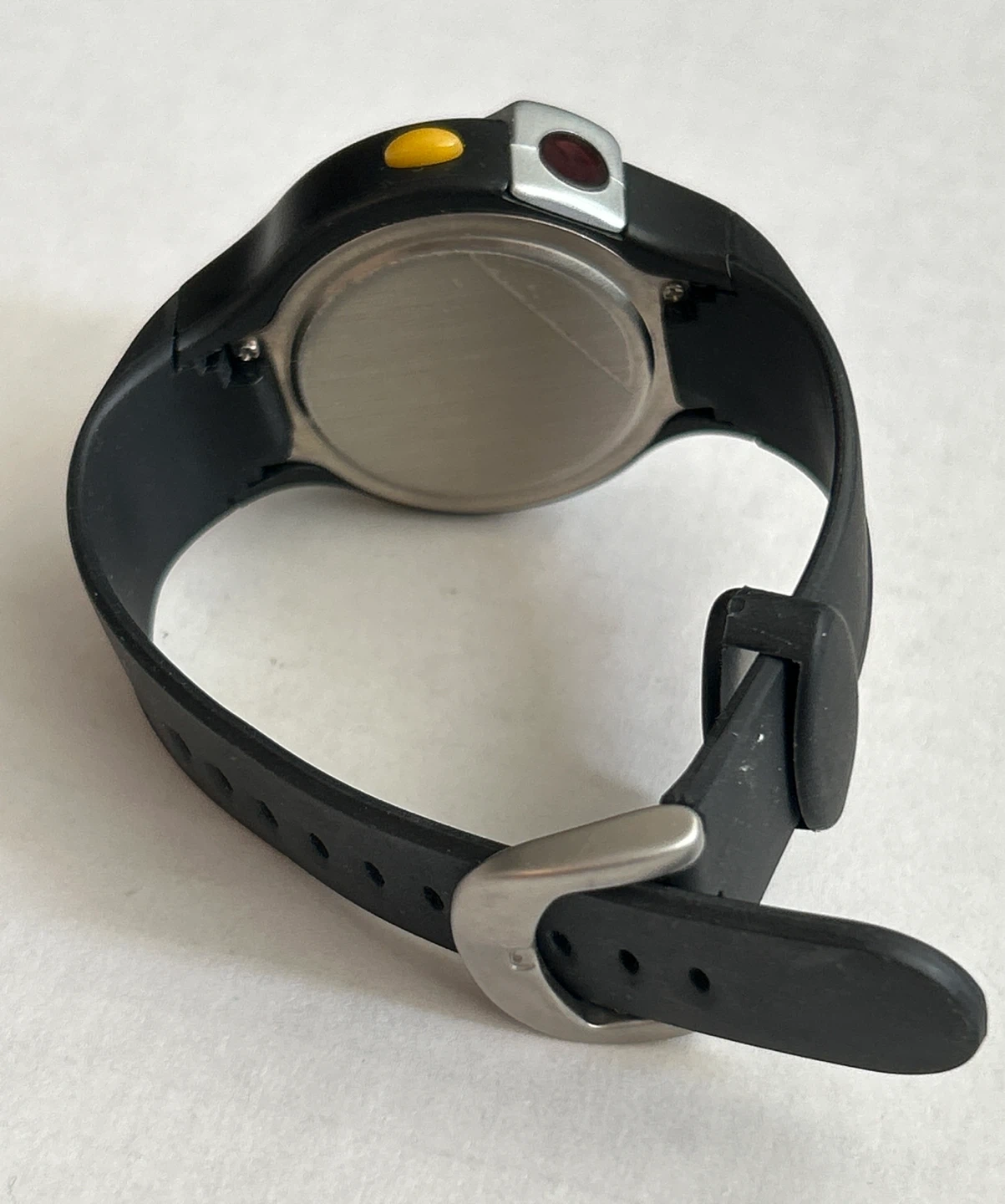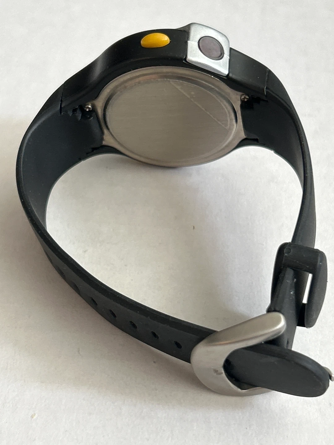 Black digital sports sensor watch with a black silicone band. Features include a sensor and multiple buttons for mode selection and setting. It's a durable choice for everyday use or workouts. Still have the plastic cover on it. Could also need a new battery.