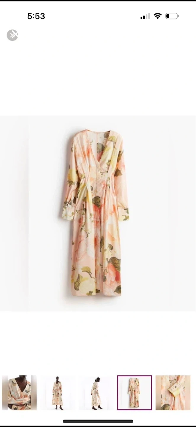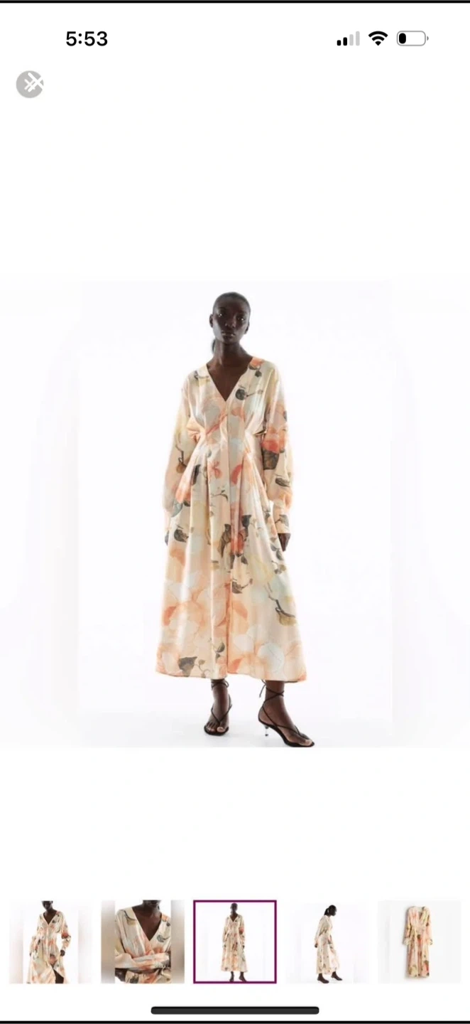 This is a beautiful floral print maxi dress. It has a V-neck and long sleeves with buttoned cuffs. The dress is perfect for a special occasion or a night out. It was a present, never worn. Brand new.
