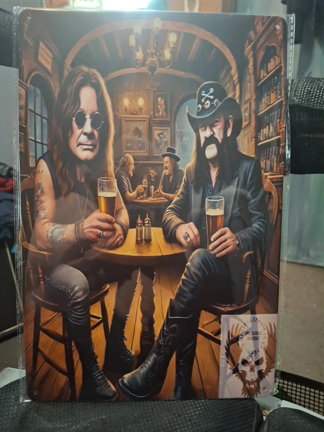 Metal wall sign featuring Ozzy Osbourne and Lemmy Kilmister. Perfect for any rock and roll fan's bar or rec room. This decorative piece brings a classic vibe to your space!