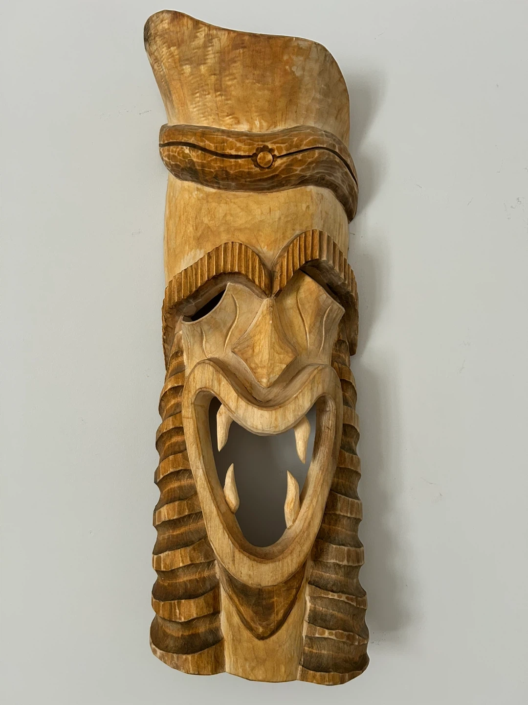 A striking hand-carved wooden Tiki mask, perfect for adding a bold South Pacific vibe to your home, patio, or tiki bar. This 26-inch mask features a traditional Polynesian-inspired “warrior” design with a fierce open-mouthed expression, detailed fangs, and intricate geometric carvings.