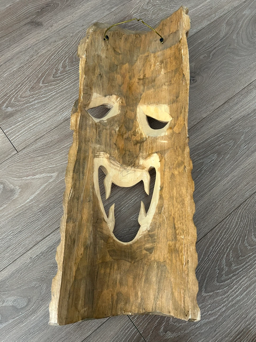 Crafted from natural wood, likely Albizia or a similar tropical hardwood, the piece showcases authentic hand-tool marks that give it character and uniqueness. The rich brown finish highlights the wood grain and adds warmth, making it a standout wall display. A built-in hanging loop on the flat back allows for easy mounting, turning it into a dramatic focal point in any room.