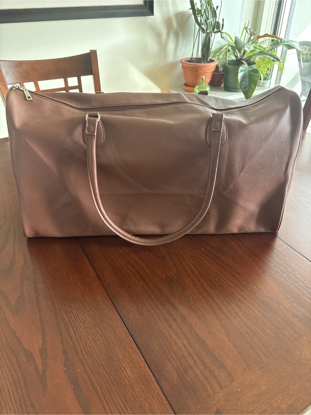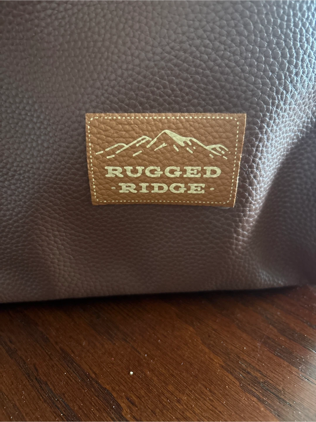 Brown faux leather duffle bag by Rugged Ridge. It has sturdy handles and a zippered closure. This bag is suitable for weekend trips or gym use. Brand new.