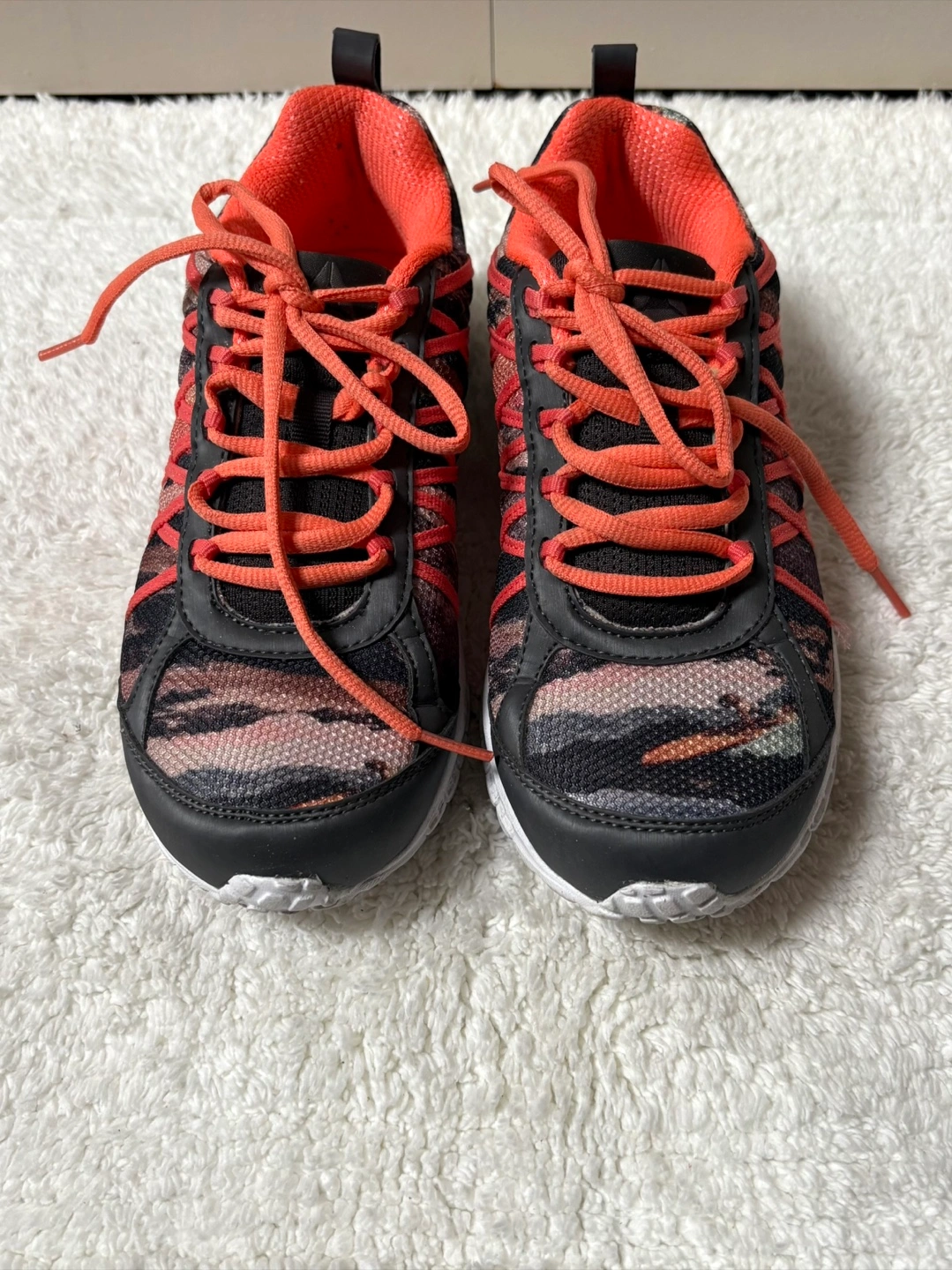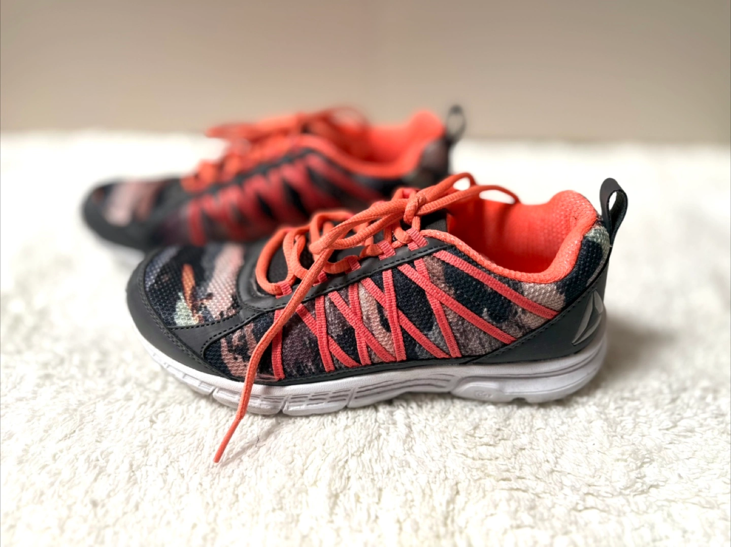 These shoes are primarily black and grey with vibrant coral accents and a camouflage pattern.