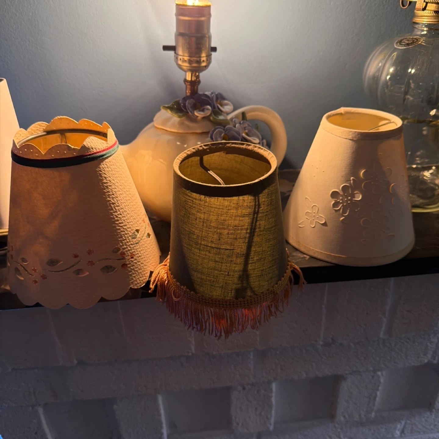 This charming ceramic lamp is shaped like a teapot and decorated with delicate floral designs. It includes three interchangeable lampshades for different lighting styles. A unique piece for any home decor!