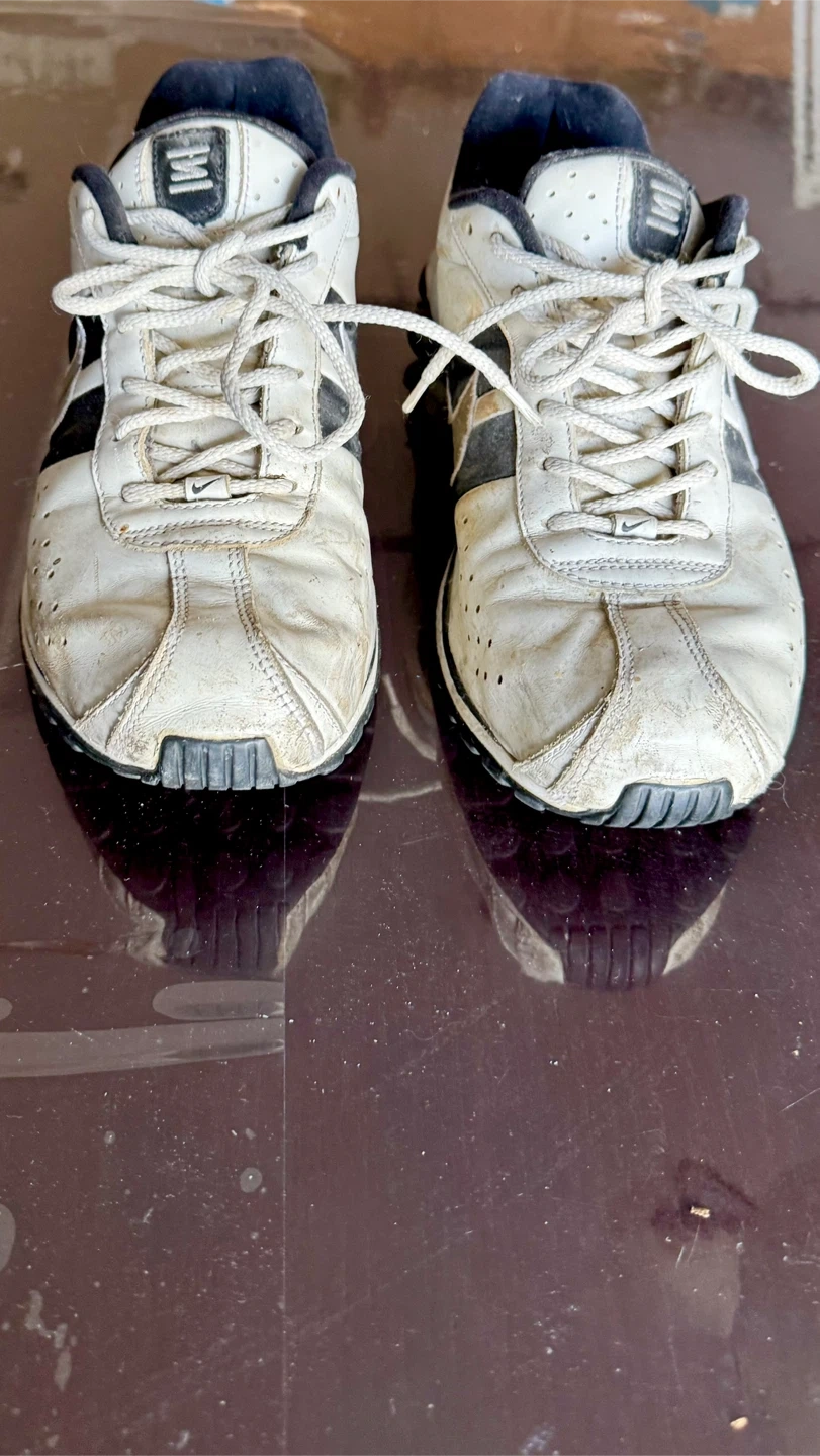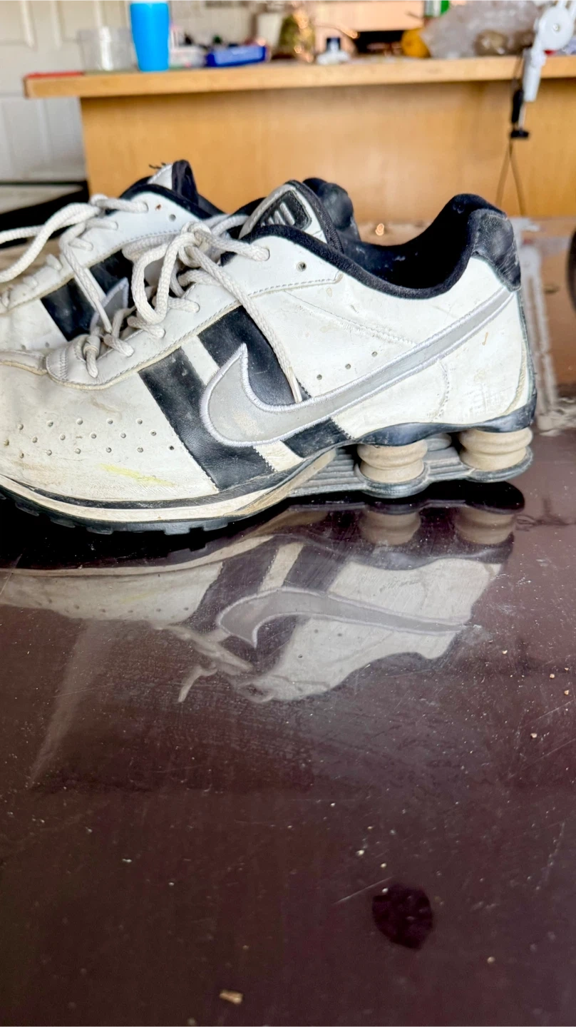 White and black Nike Shox running shoes. Lace-up closure with synthetic leather and mesh upper. Shows some signs of wear and dirt. Great for casual wear or light training!