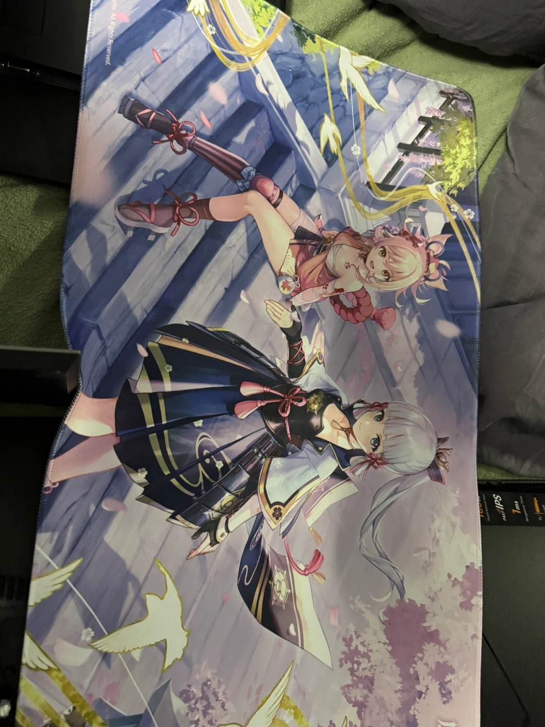 This large desk mat features characters Yoimiya and Ayaka from Genshin Impact. It's made from a smooth fabric surface with a rubber base for stability. Perfect for gaming or as a decorative piece for any fan!