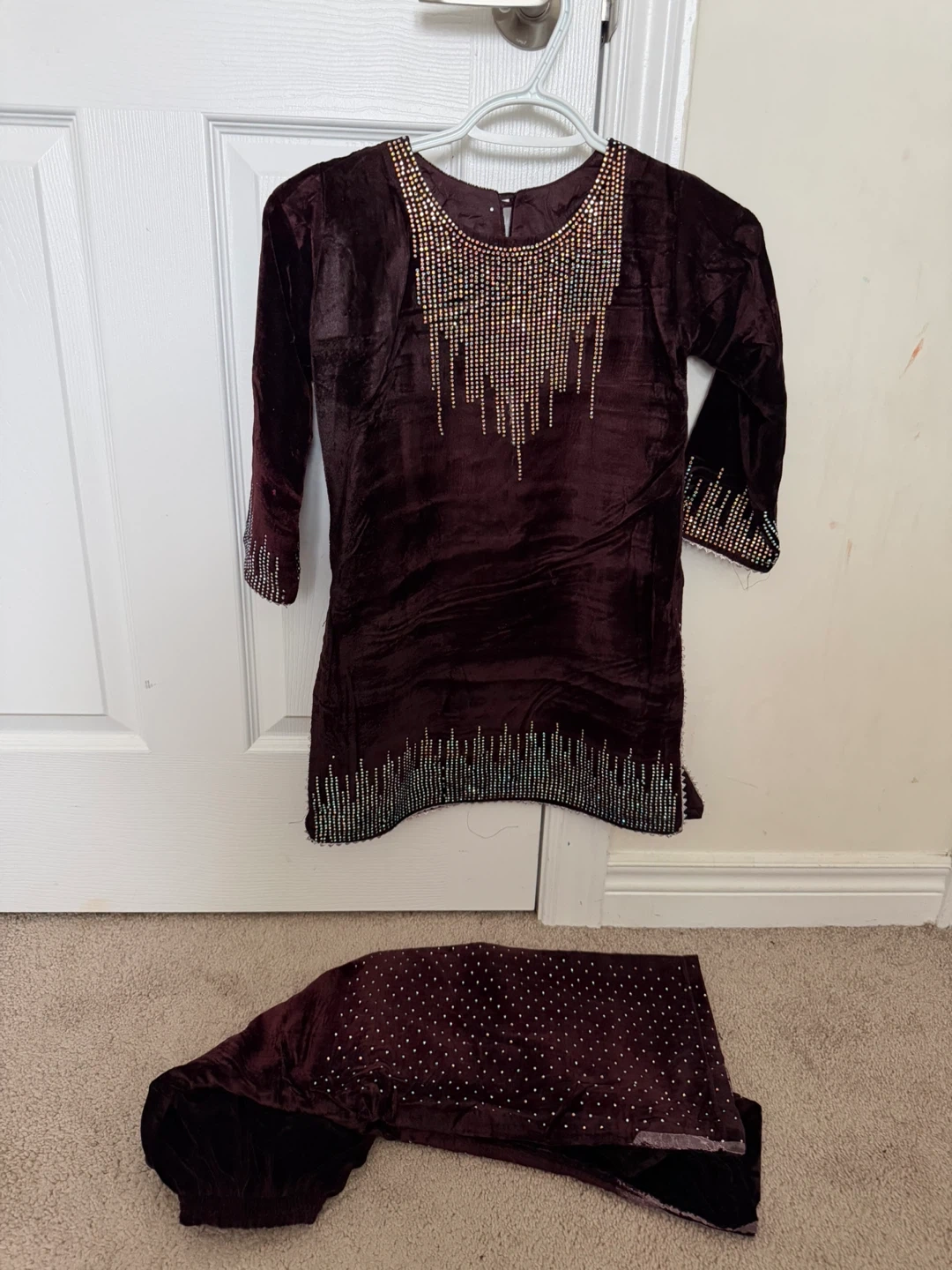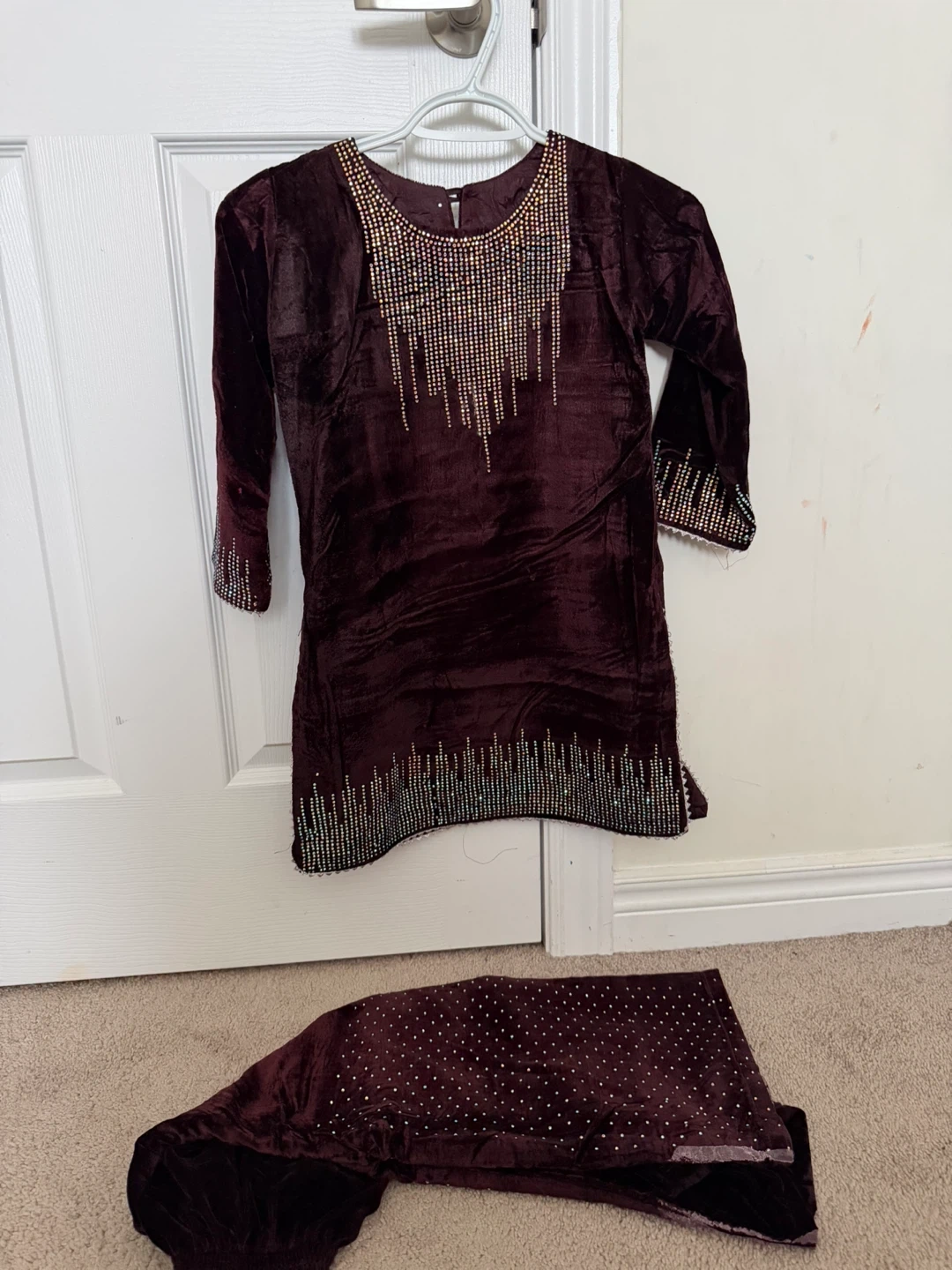 This is a beautiful brown colour velvet kurti and pant set for kids. It's embellished with sparkly beads and sequins along the neckline, sleeves, and hem. The material feels soft and would be lovely for special occasions!