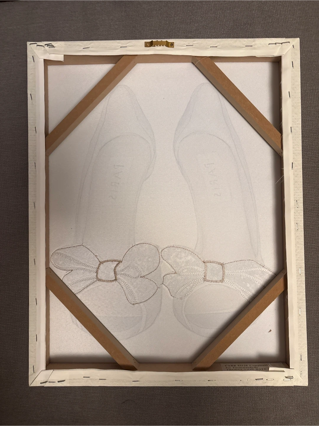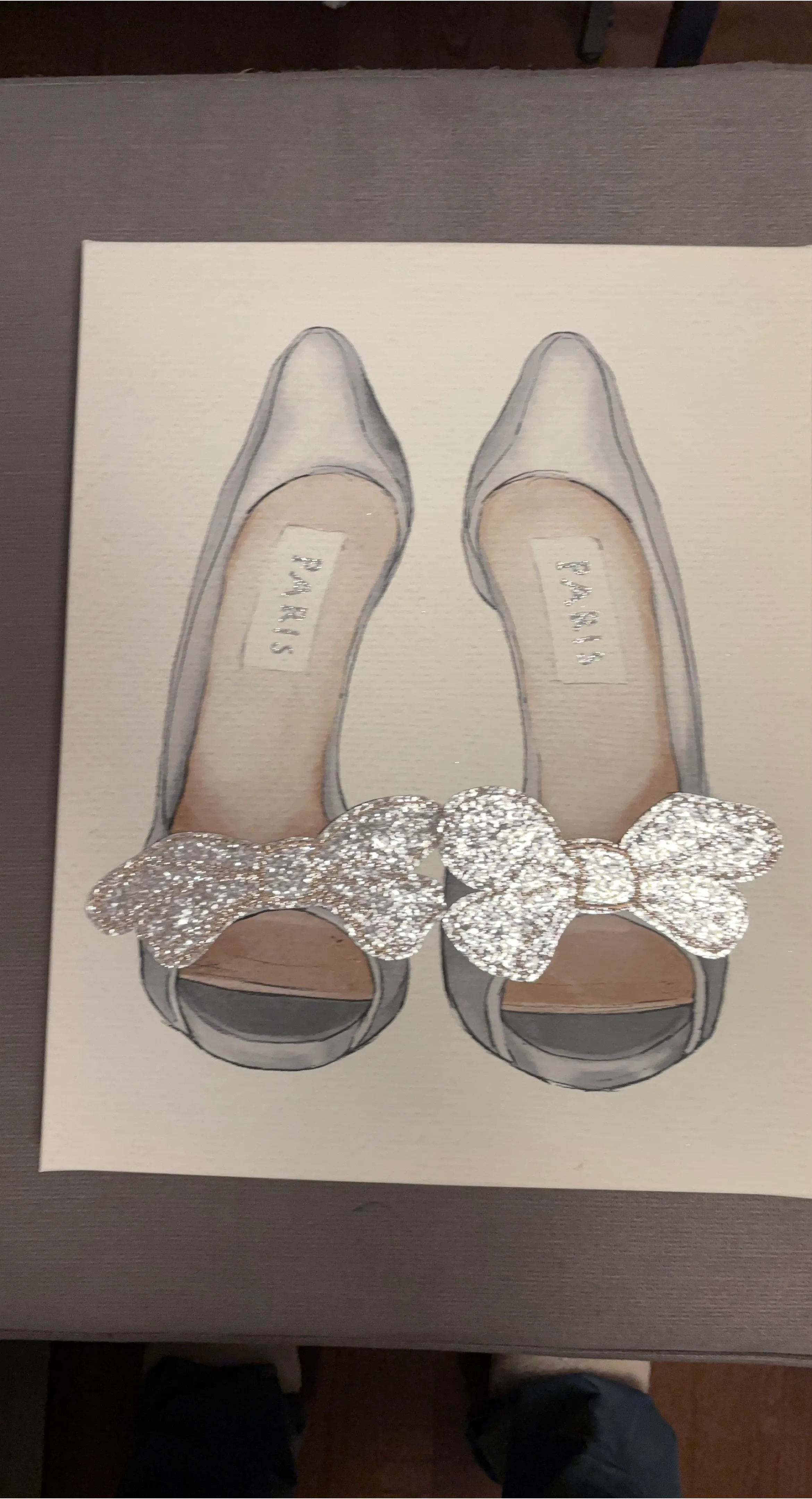 This charming canvas art features a watercolour painting of silver peep-toe heels adorned with sparkling glitter bows. The art is stretched over a wooden frame, ready to hang. It's a lovely piece for a bedroom or dressing area!