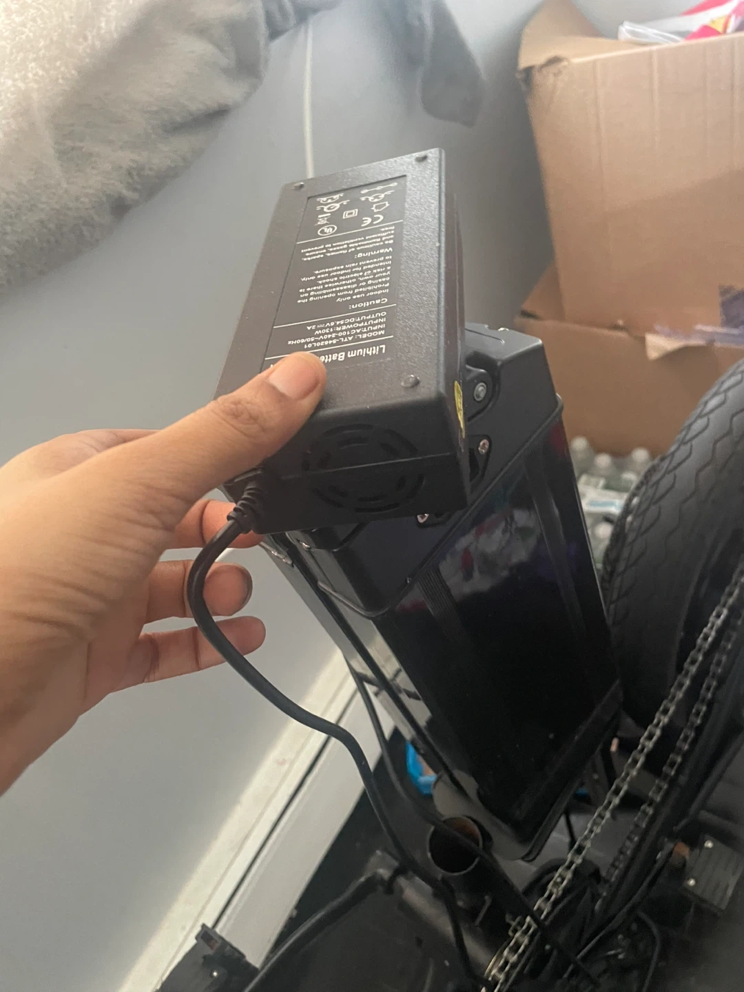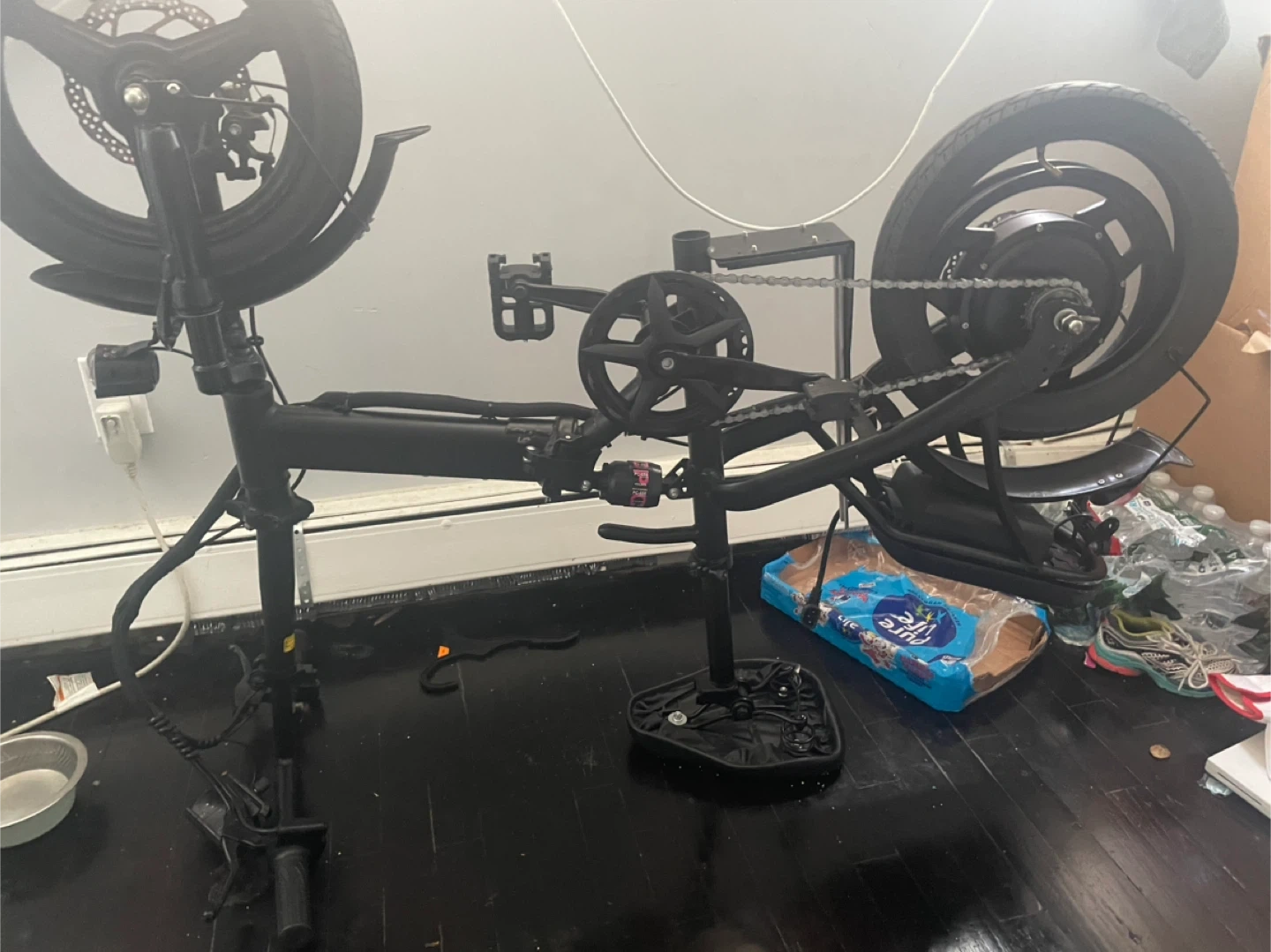 This is a black folding electric bicycle. It features a lithium battery. The frame is designed for easy folding. It’s missing a petal but it still works like new . The tire is flat in the back nothing serious I have the things to fix it, it’s just hard for me to do maybe you can. It’s a really great bike