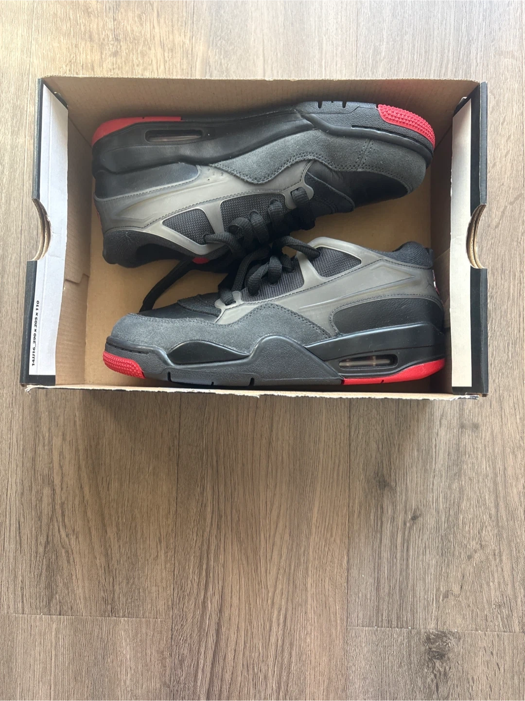 These are black Nike Air sneakers with red accents. They come with laces and are in their original box.
