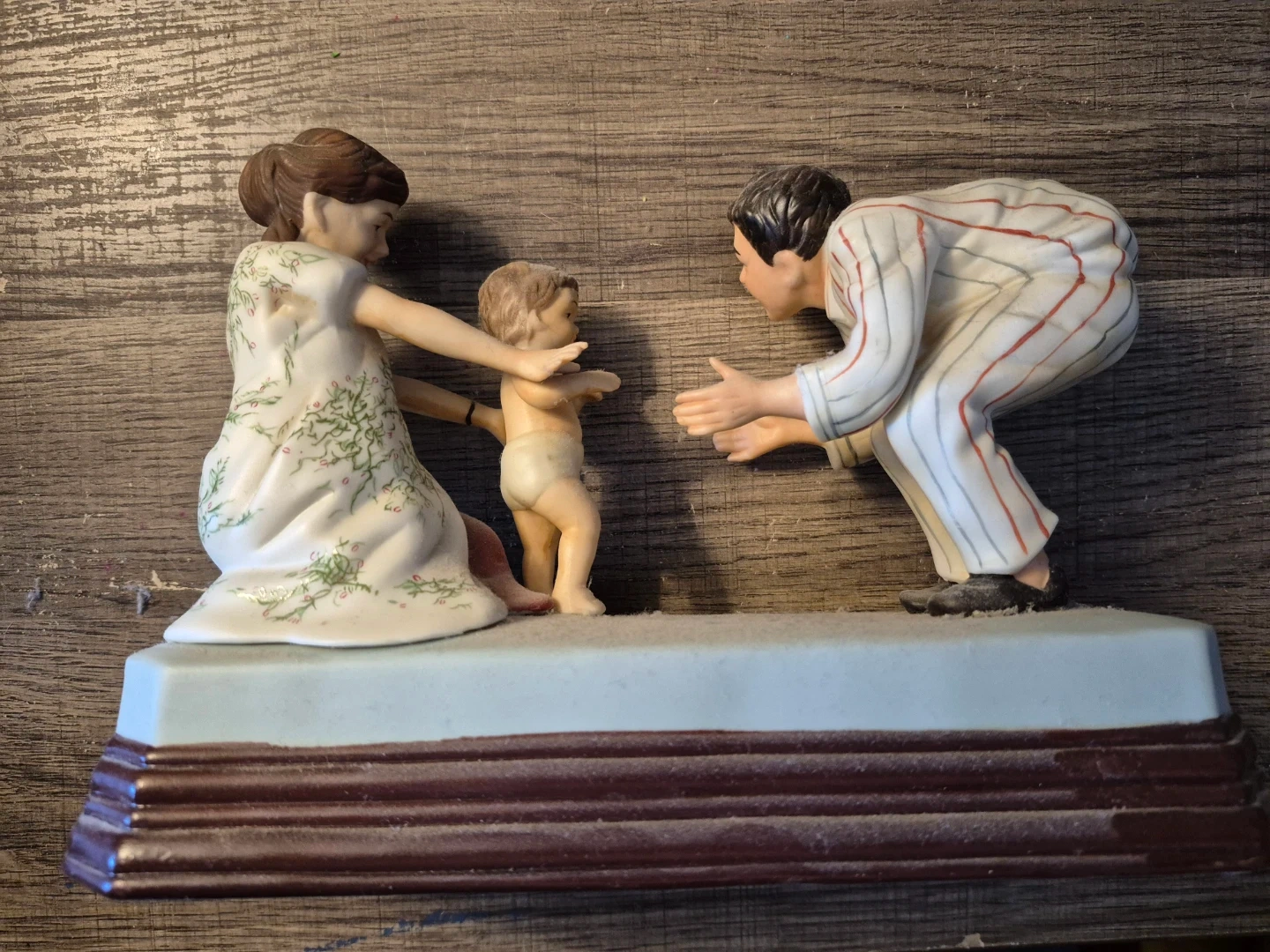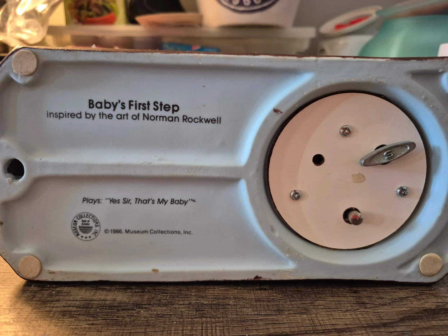 This is a vintage Norman Rockwell figurine titled "Baby's First Step". It's inspired by the art of Norman Rockwell and plays the tune "Yes Sir, That's My Baby". It was made in 1986 by Museum Collections, Inc
