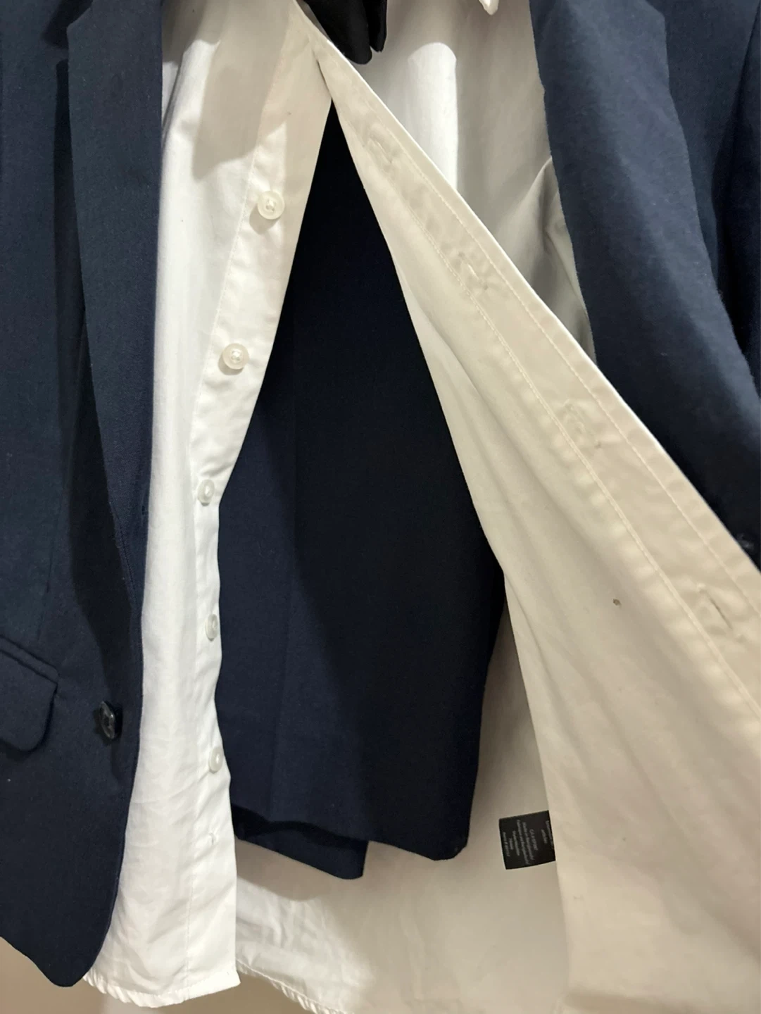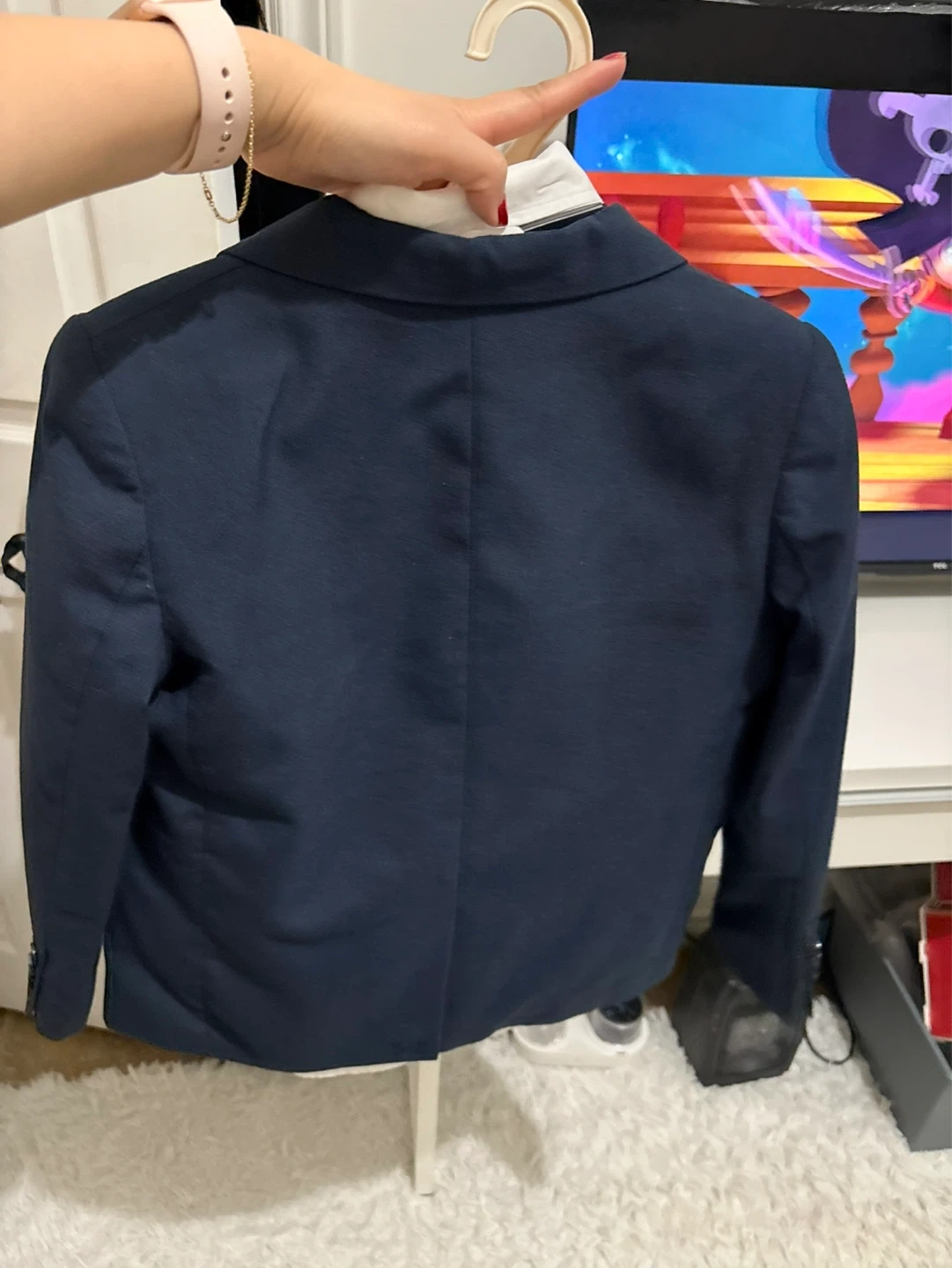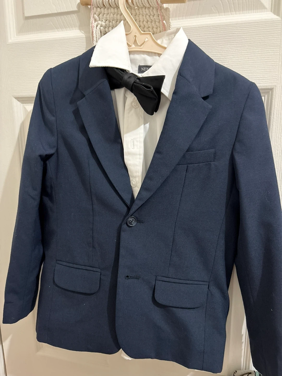 This boys' suit set includes a navy blazer, a white button-down shirt, and a black bowtie. The shirt is size 7 and made by Newberry, while the blazer has a Cat & Jack tag also indicating size 7. It's perfect for special occasions or dressy events!