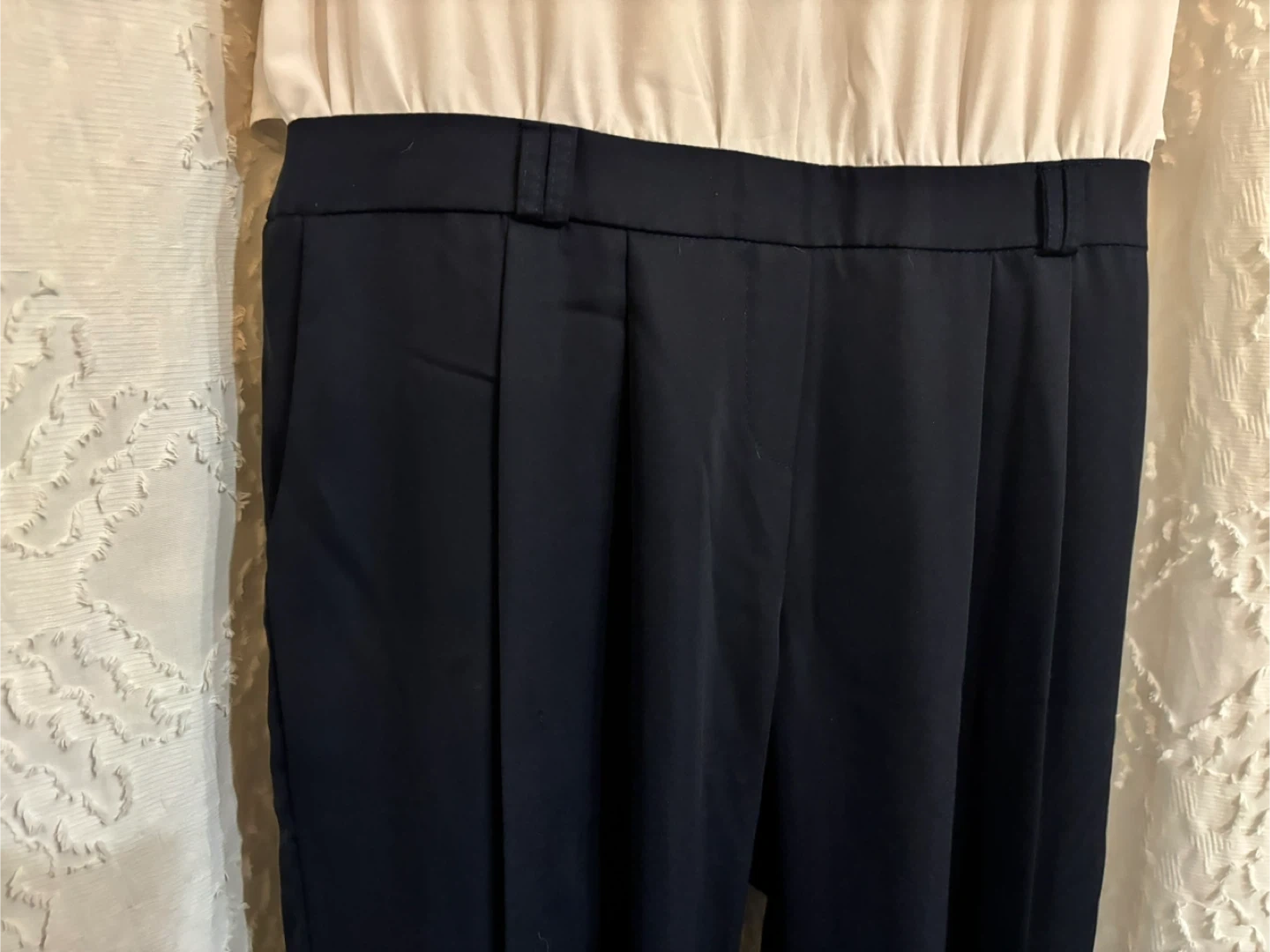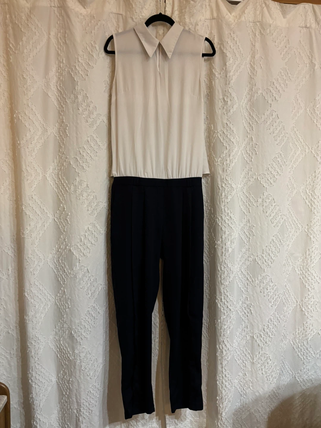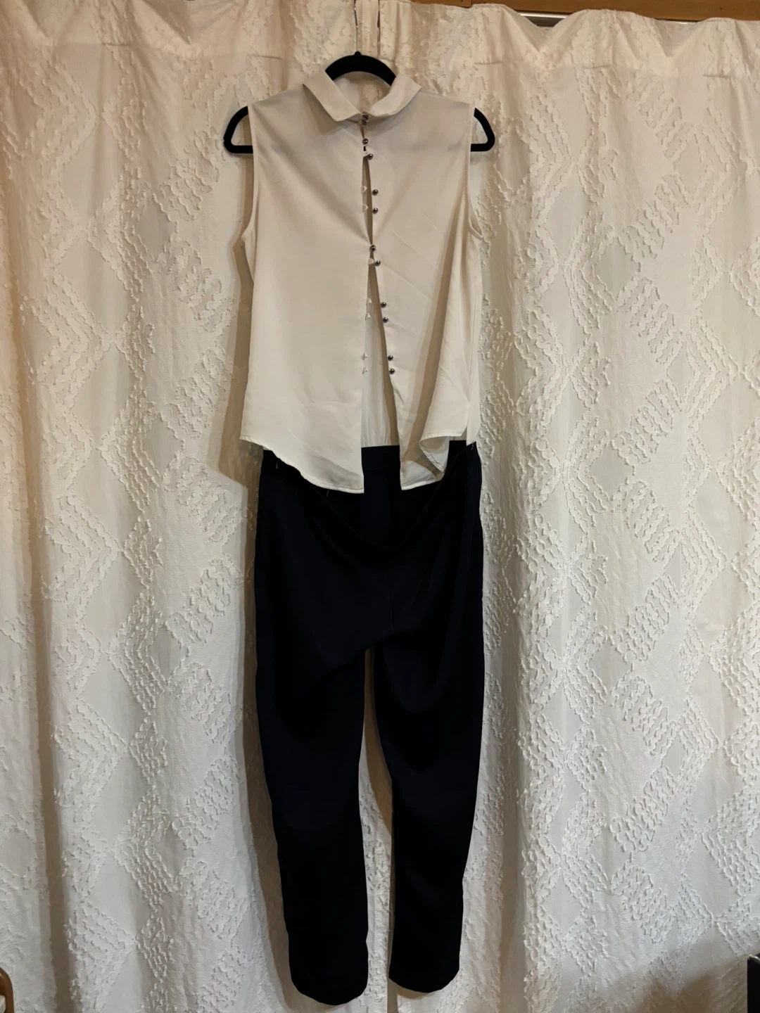 This is a chic sleeveless jumpsuit featuring a white collared top with a row of silver buttons going down the back and navy tailored pants. The pants have a 38-inch waist, 39-inch leg, and 52-inch hip measurement. It's a versatile piece for various occasions!