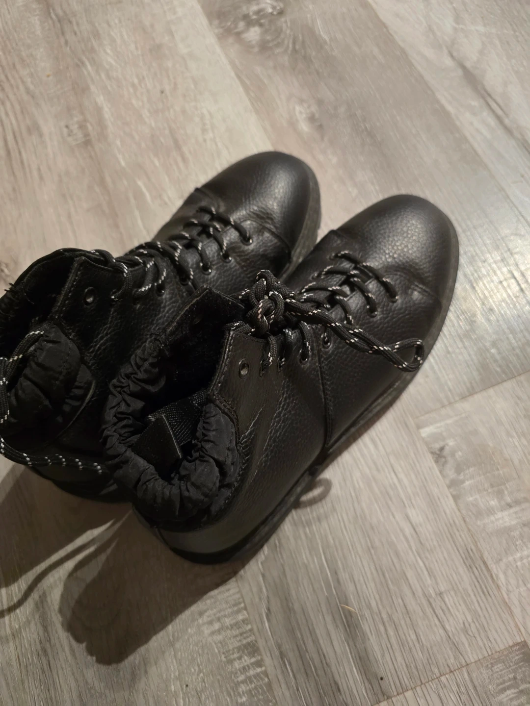 Pair of black leather boots with sturdy soles and laces. These boots are made of genuine leather and feature a padded collar for extra comfort. They're great for everyday wear.