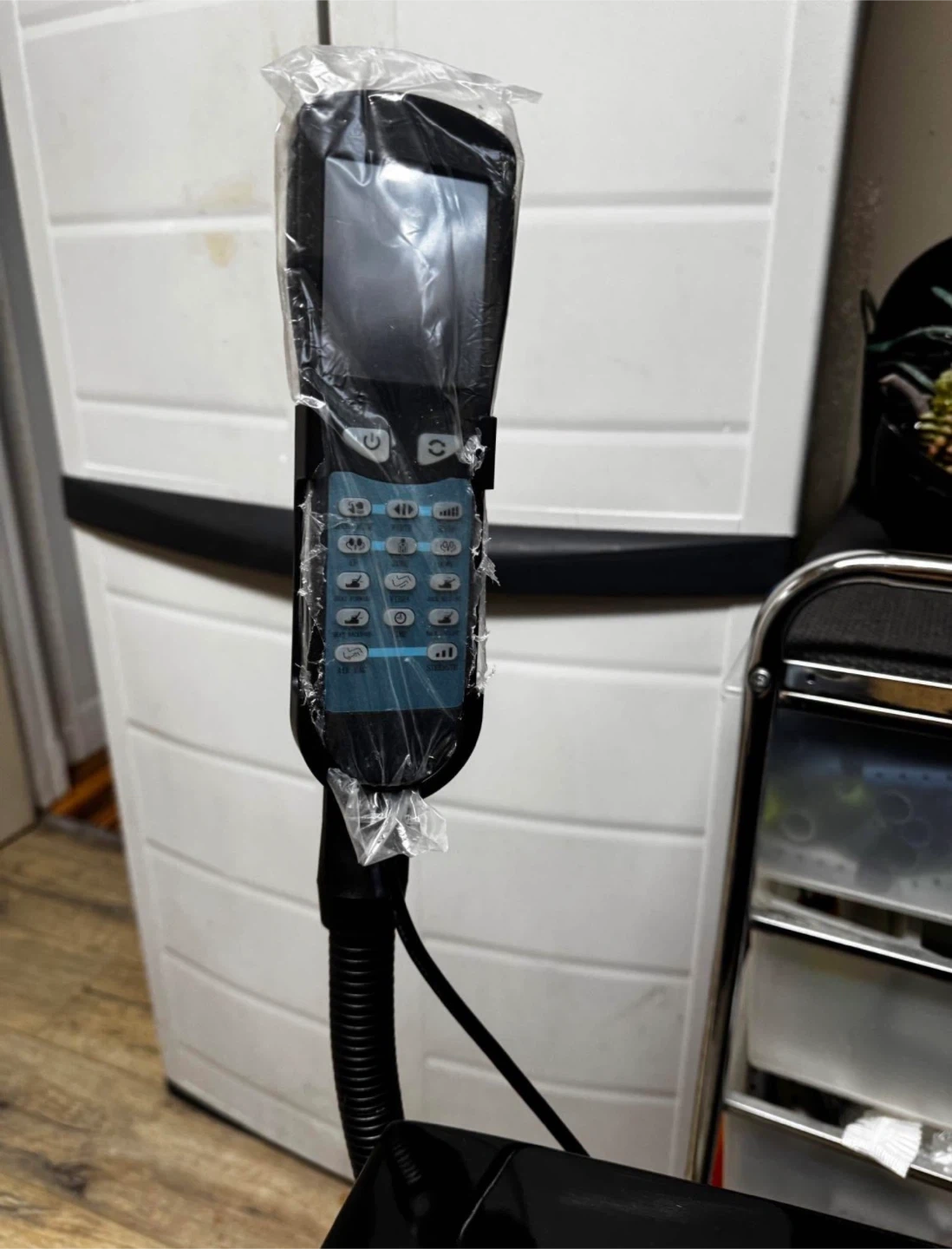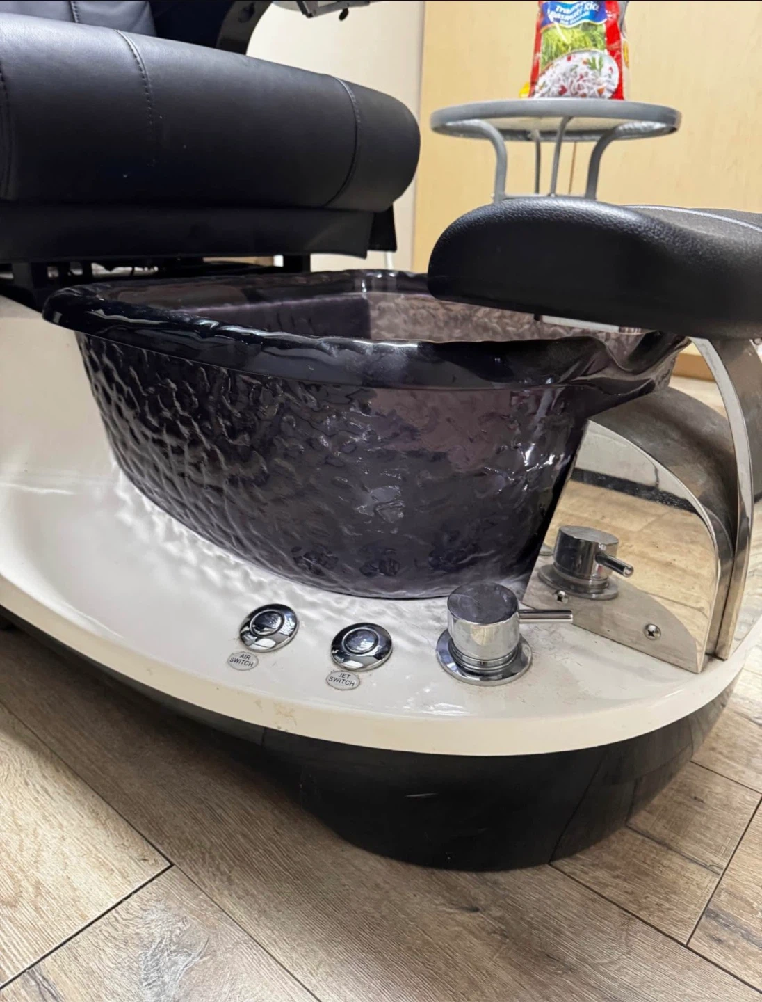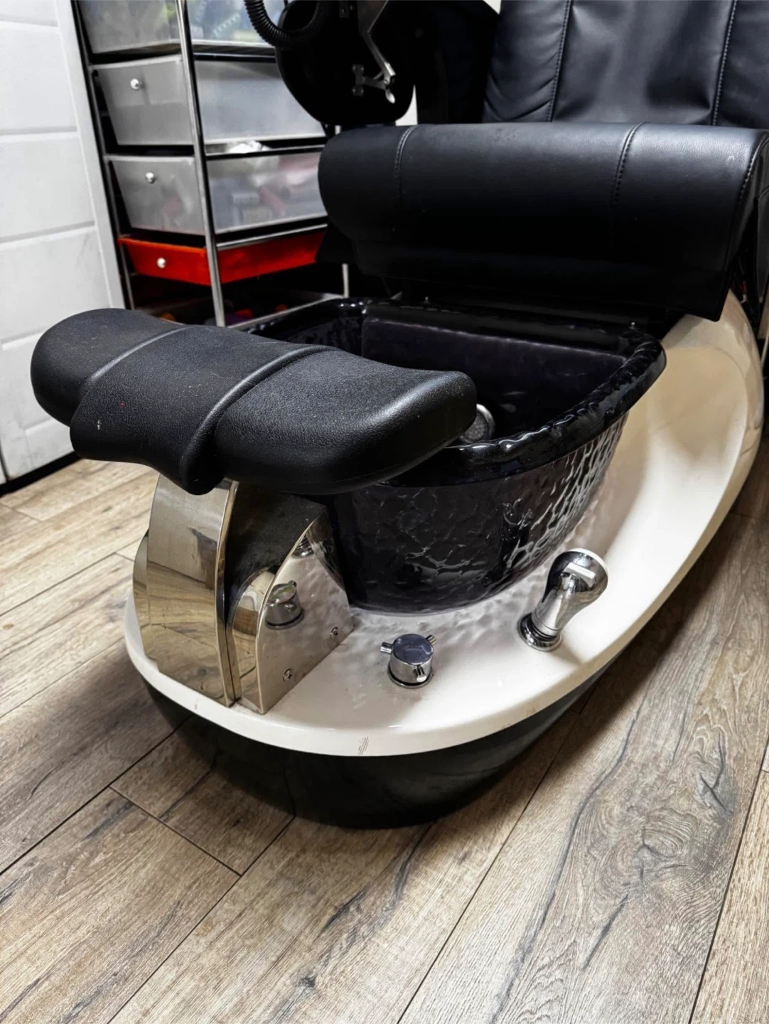 This black leather pedicure chair features a built-in foot bath and massage function for ultimate relaxation. It comes with a remote control for easy operation. It's perfect for salons or home use.