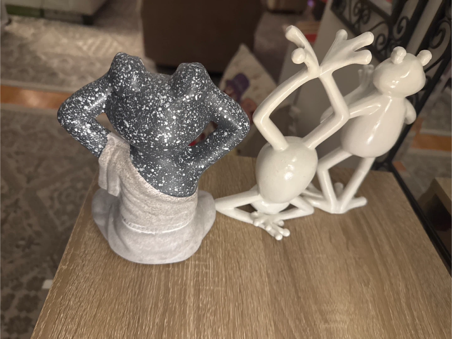 This set includes three charming frog figurines, each with a unique pose. One frog is dark gray with white speckles and wears a light gray draped cloth. The other two frogs are white, with one in a yoga pose and the other upside down. They're made of a durable material and offer a whimsical touch to any decor.