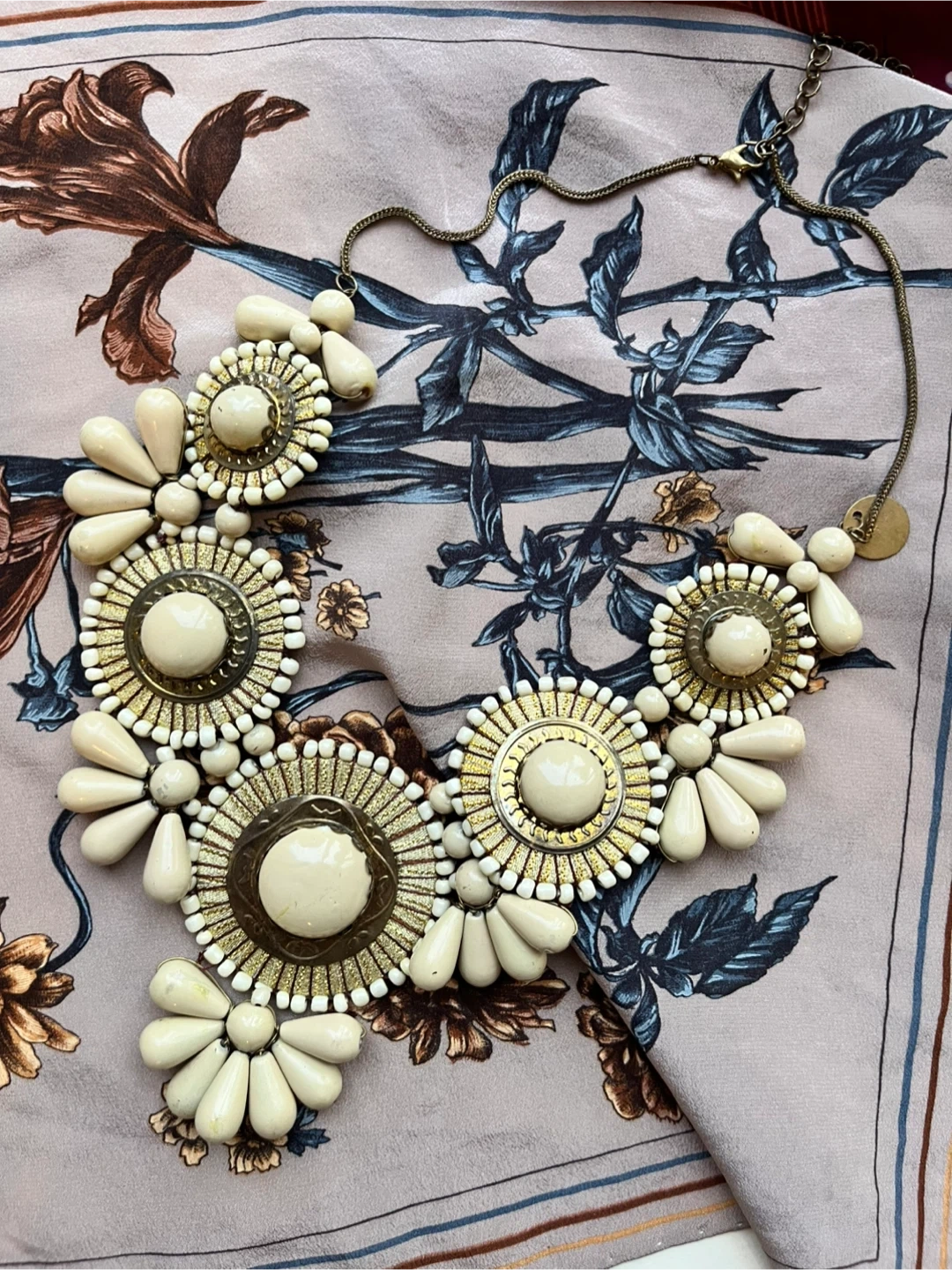 Selling a beautiful statement necklace with a unique floral design. It features beige and gold tones, making it a standout piece for any outfit. The necklace is in excellent condition and ready to add some flair to your wardrobe!