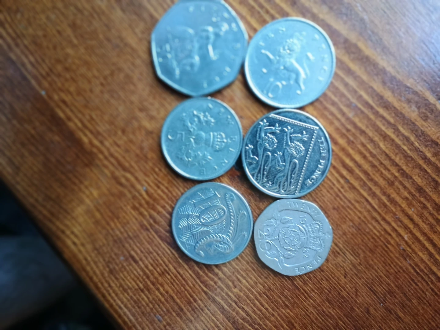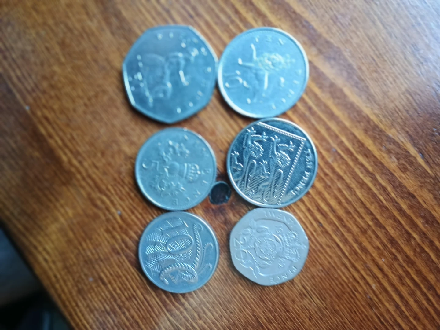 Six assorted coins including UK 50p, 10p, 2p, 1p and Australian 5c and 2c coins. All made of metal. These coins are great for starting a collection or for educational purposes.