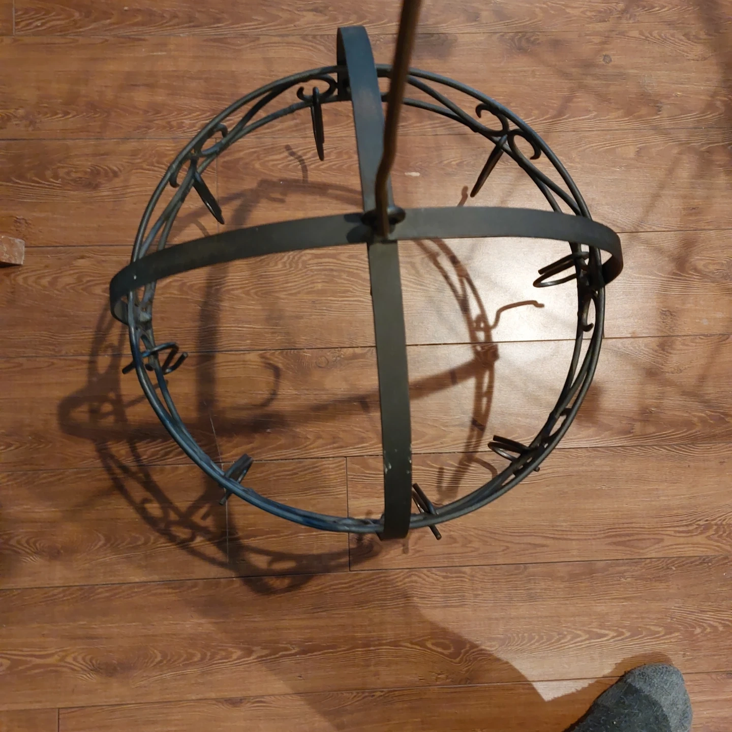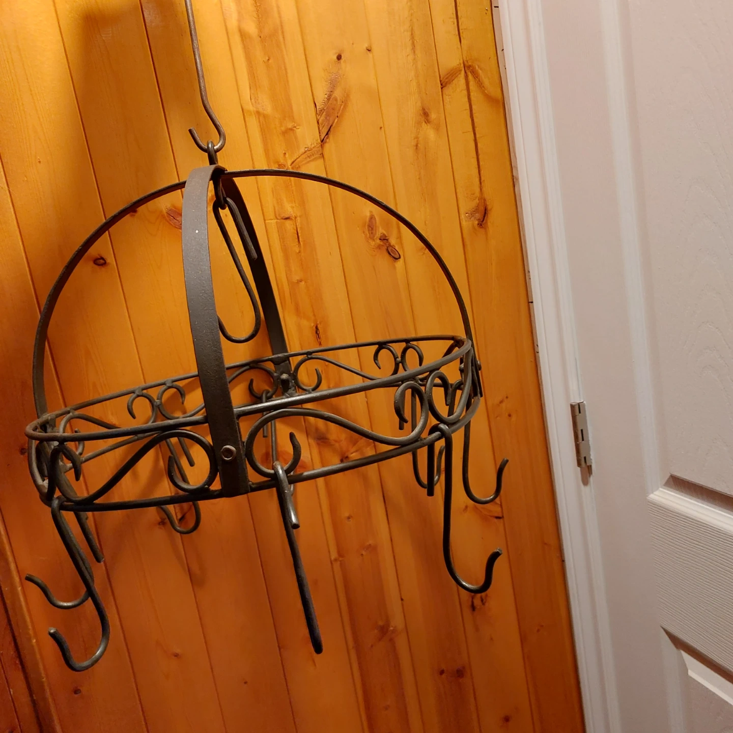 A metal pot rack with decorative scrollwork and multiple hooks. It's designed for hanging cookware and kitchen utensils. This rack could be useful for organizing a kitchen or for displaying pots and pans.