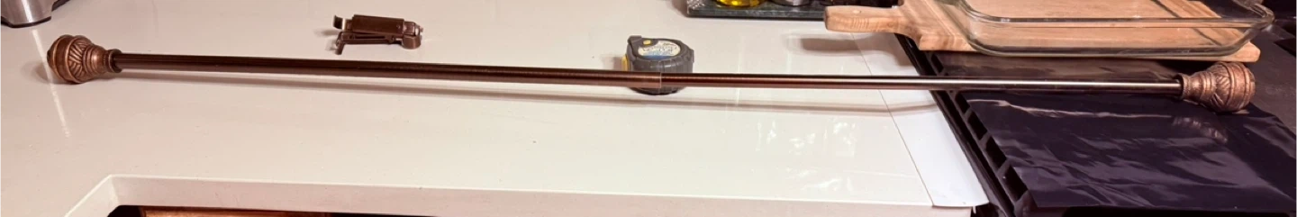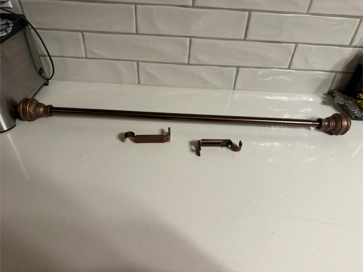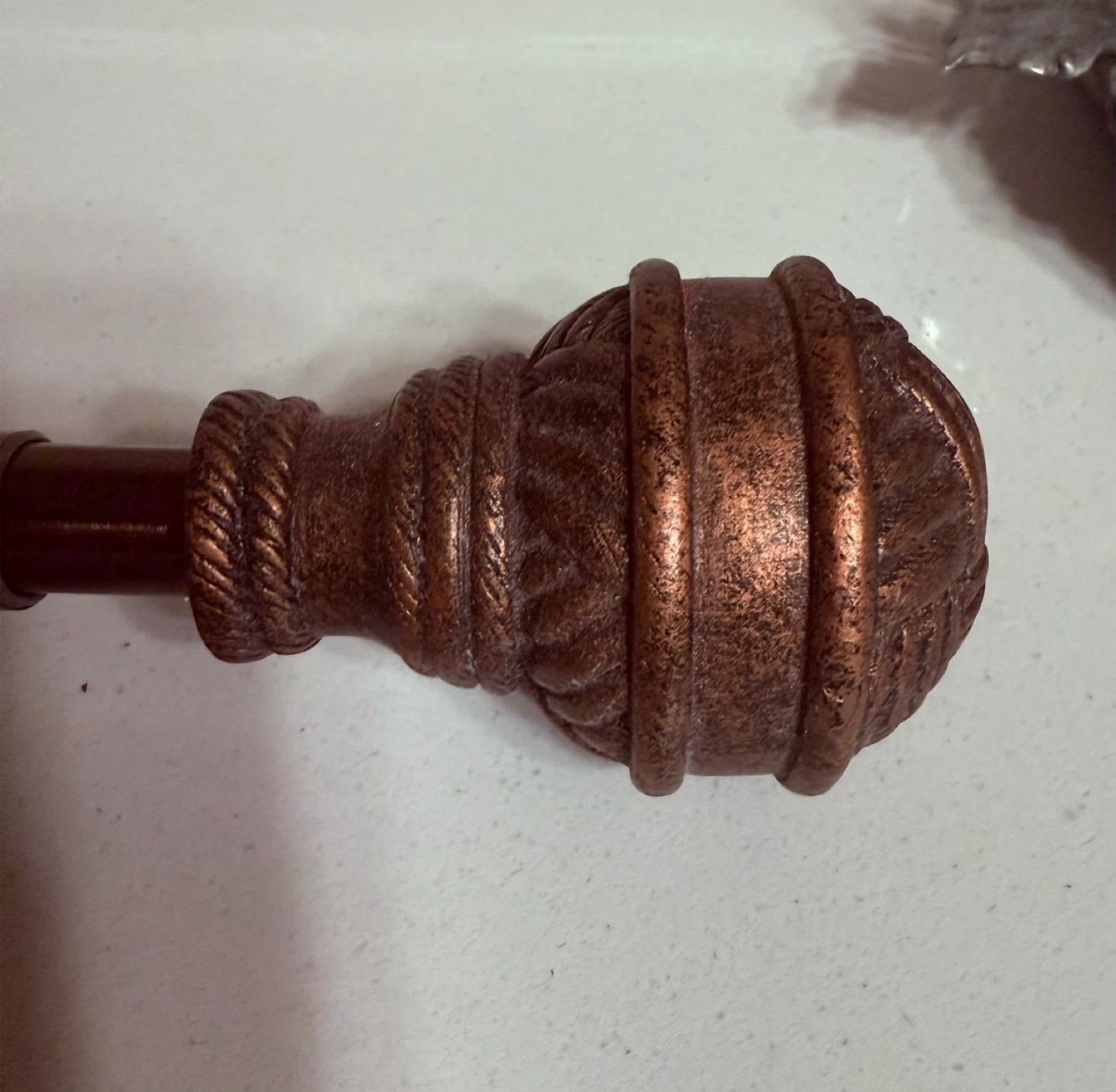 Adjustable strong curtain rod in a copper/bronze metal finish. Includes decorative finials, and mounting brackets. Measures 26” non extended without finials or 32.5” with them.