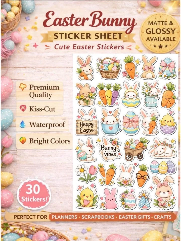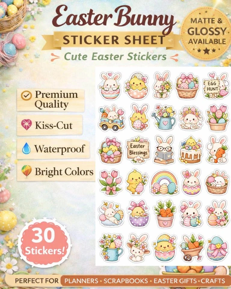 Cute sticker sheets perfect for decorating your favorite items. Great for laptops, water bottles, phone cases, notebooks, scrapbooks, planners, and gifts. High quality matte stickers, easy peel kiss-cut stickers with bright and cute designs. Let me know if you're interested!