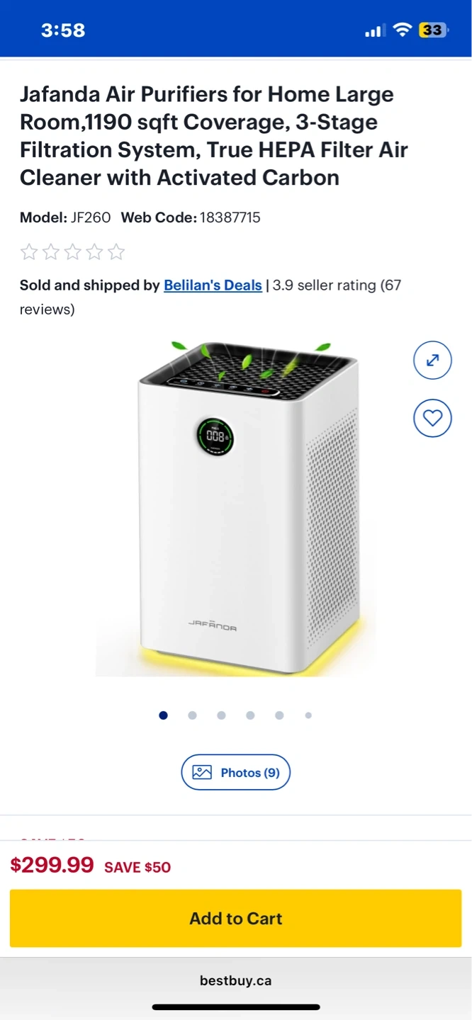 Jafanda air purifier with True HEPA filter and activated carbon. It offers 3-stage filtration and covers up to 1190 sqft. This model is JF260.