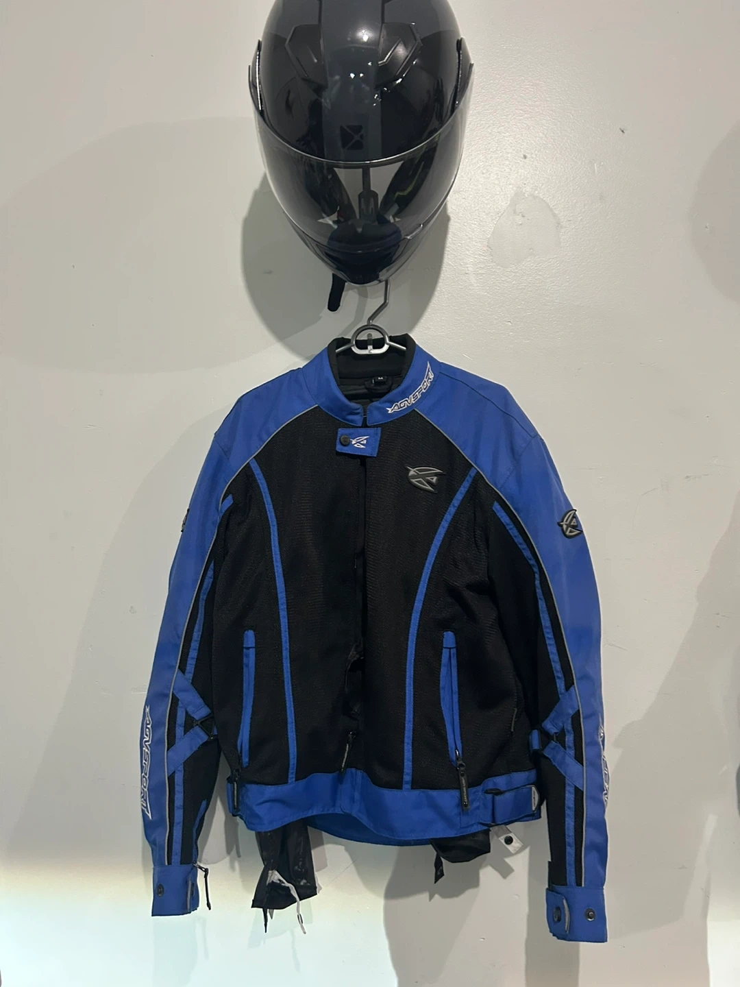 2 jackets, 2 helmets, 2 helmet mount stands. This is a high-visibility Oxford motorcycle jacket with reflective accents. It also includes an LS2 motorcycle helmet. Both are in good condition.