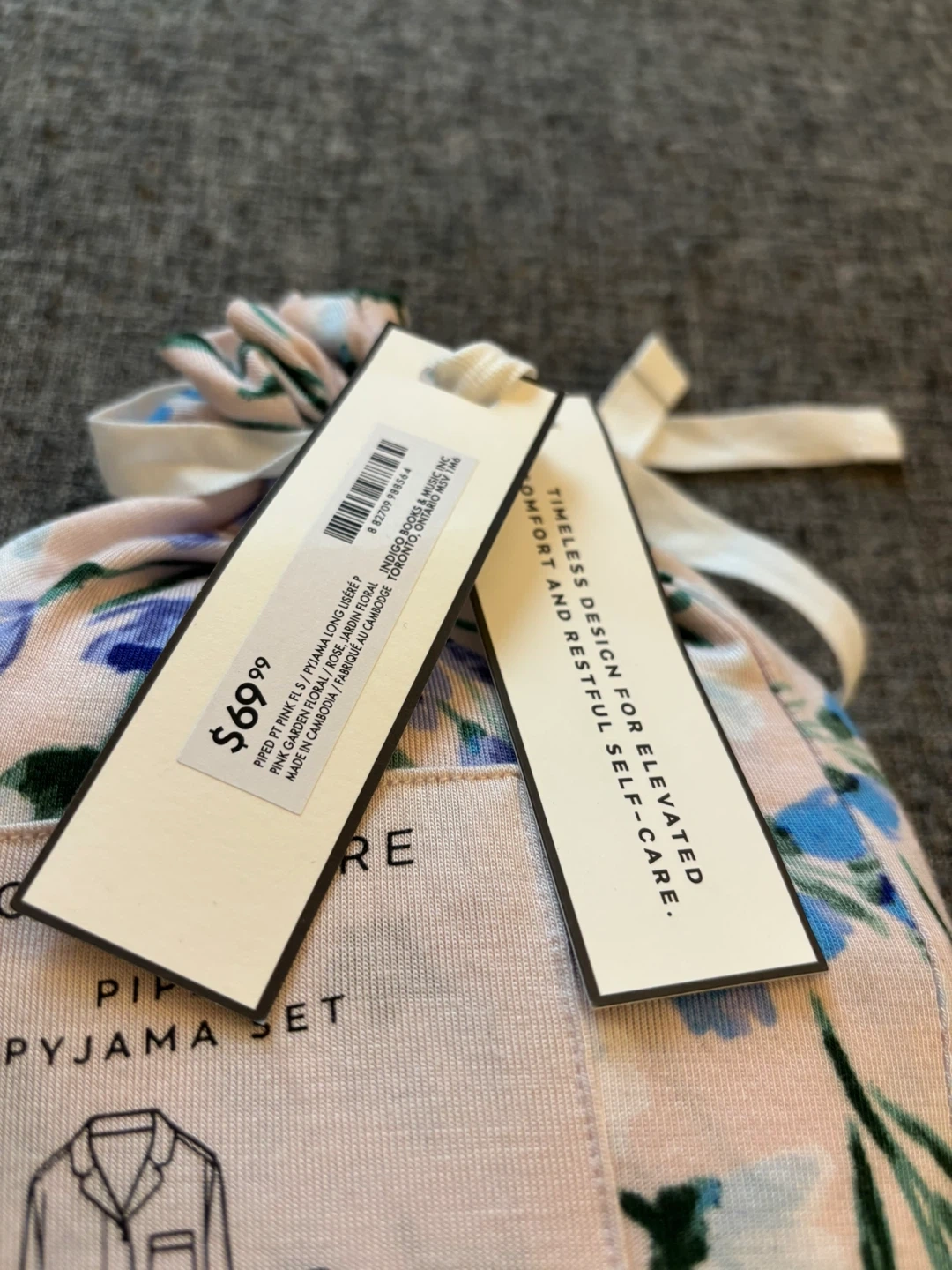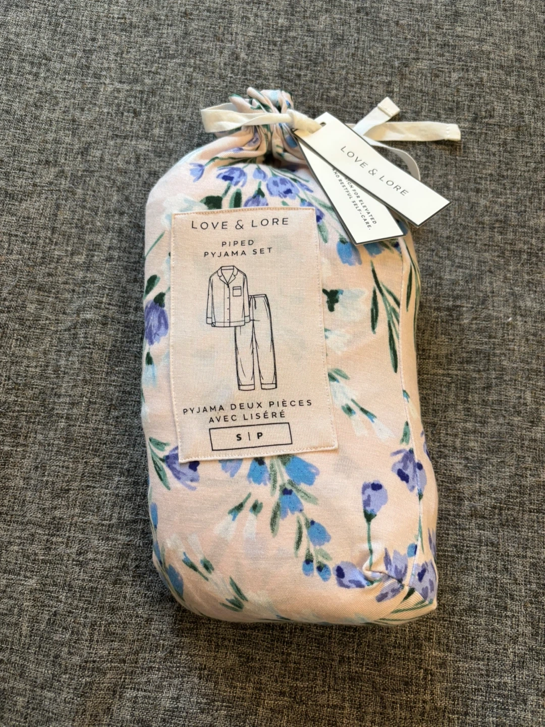This is a Love & Lore piped pyjama set in a pink floral pattern. The set is size small. It's made of viscose and elastane for comfort.