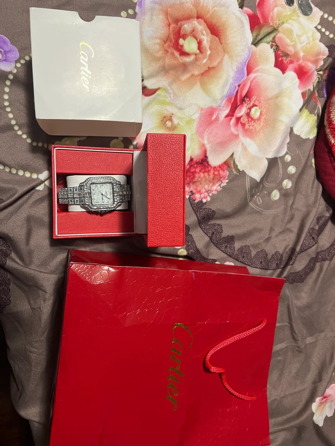 A beautiful Cartier watch in its original box. This timepiece is fully loaded with beautiful stones and features a classic Arabic Roman numeral dial.